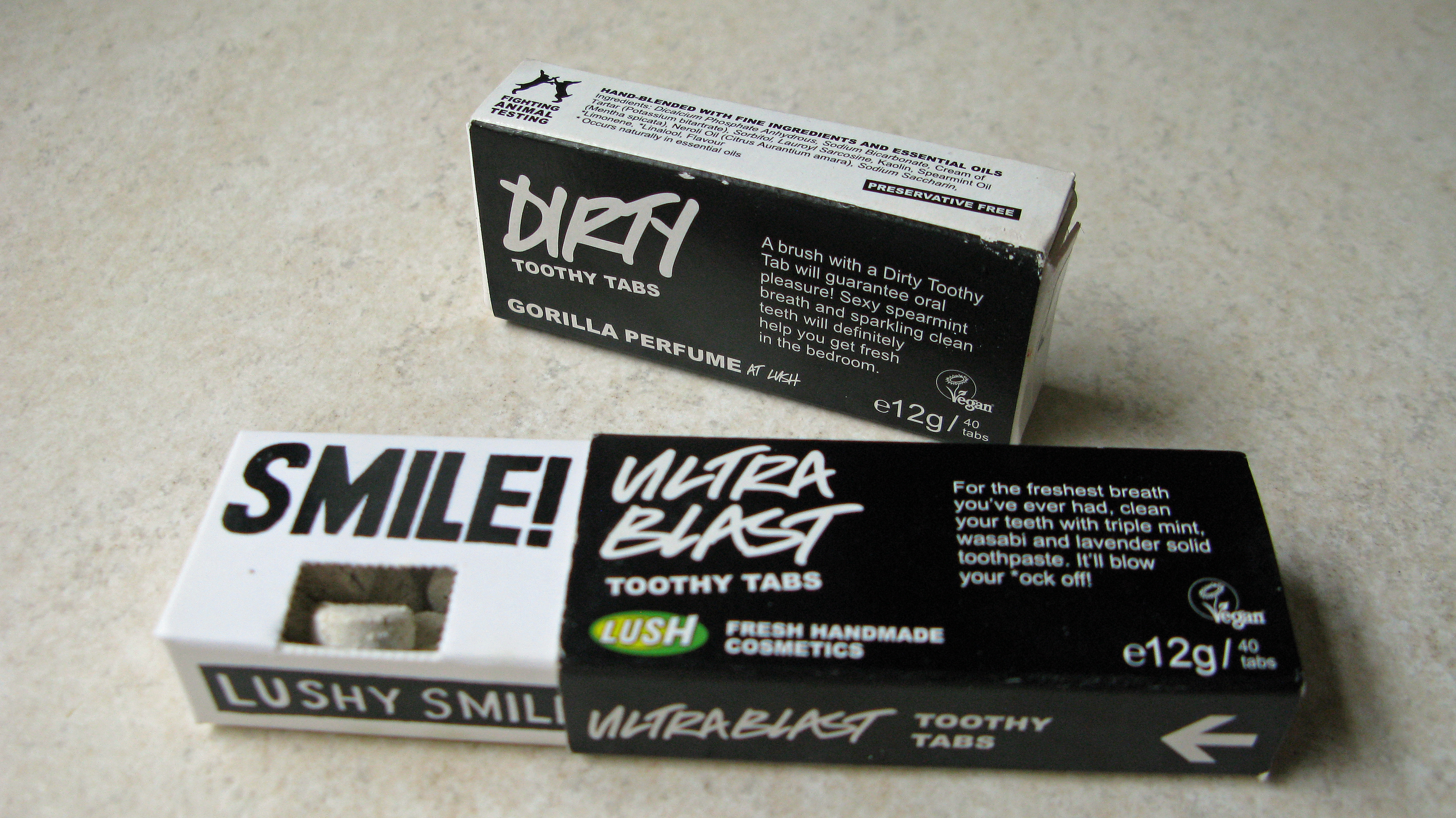 From the Lush product line, I came across Toothy Tabs. These are small solid tabs made from baking soda, kaolin clay and essential oils. Prices vary from £2 to £3 a box.