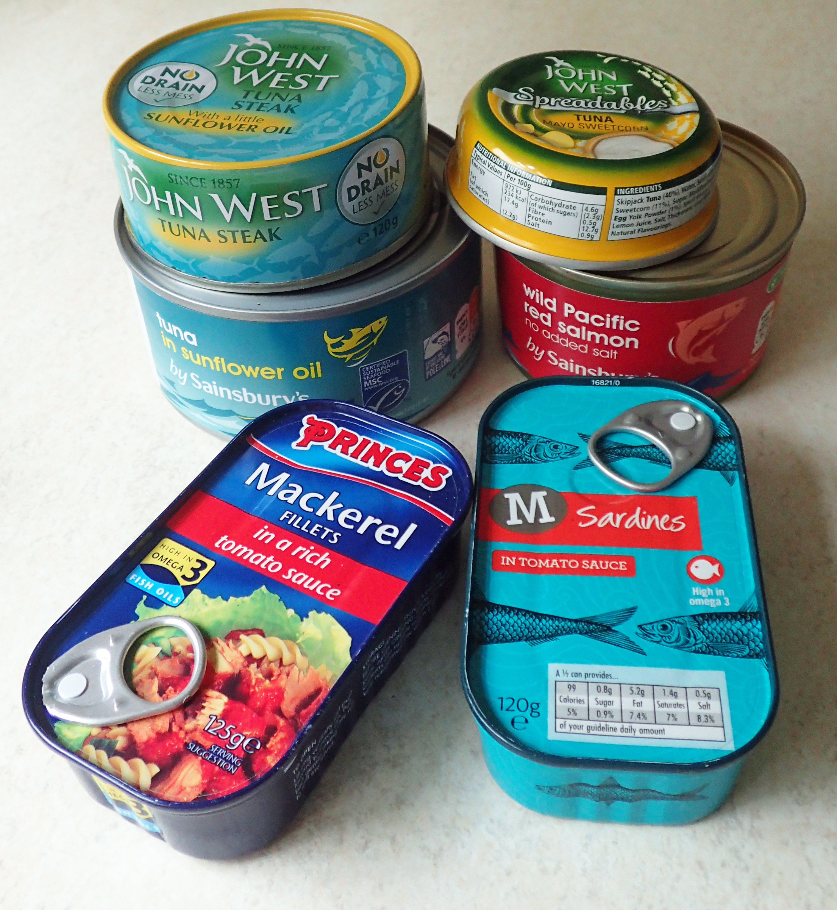 Beyond the brand names such as John West, there are many others available. Here we have Tuna and Mackerel from John West and two flavoured Tuna from Sainsbury’s