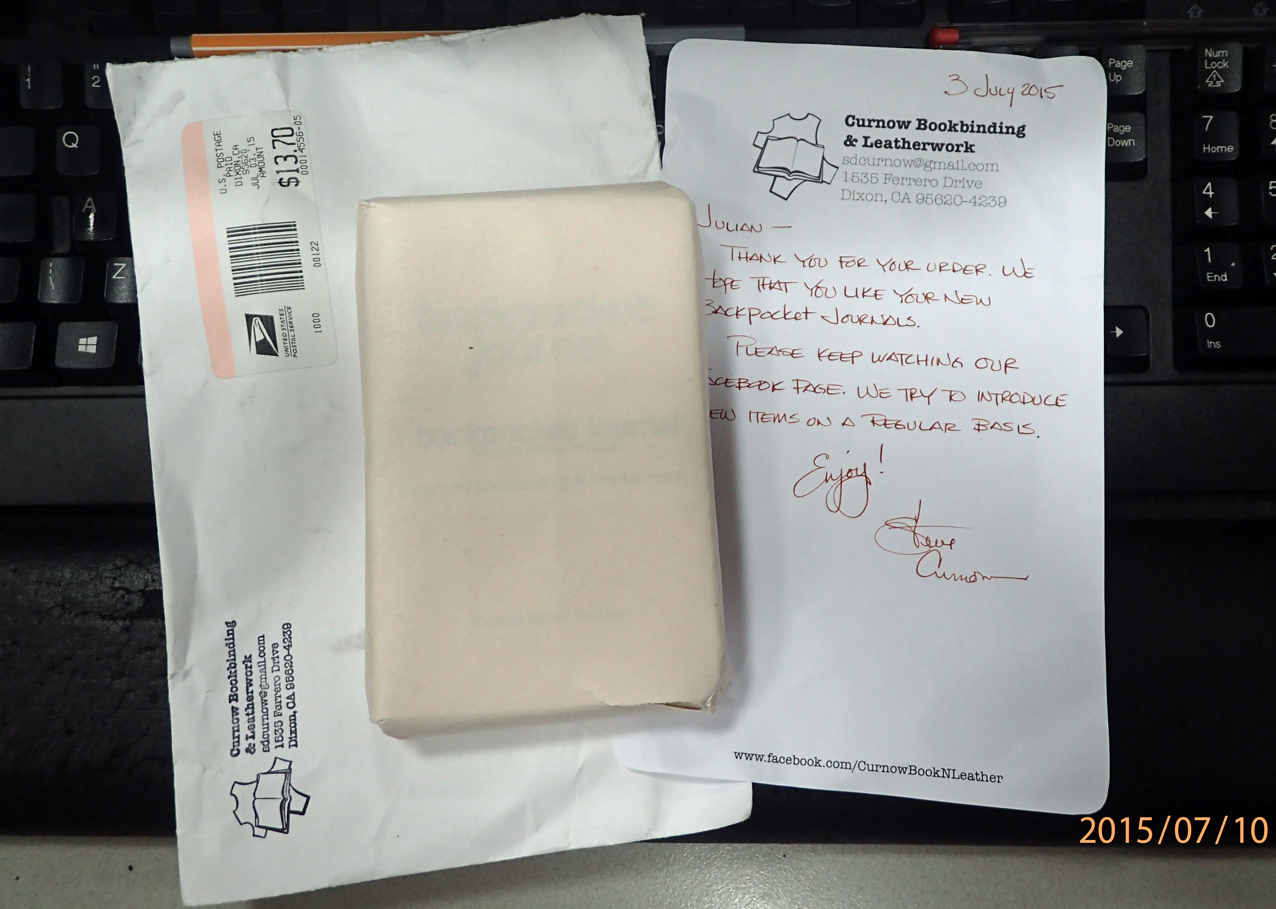 These journals are made by Steve Curnow at his Curnow Bookbinding & Leatherwork business. It is a slightly peculiar affair ordering these, you contact Steve via his Facebook page. Send him an email with your enquiry and he replies pretty promptly with what’s available and shipping costs. Curnow Bookbinding produces three packs of a standard Backpocket Journal, with a variety of snazzy covers, or alternatively, you can step up to the little gem shown here. The journal reviewed here features 52g/m² Tomoe River paper (the clue is on the front cover).