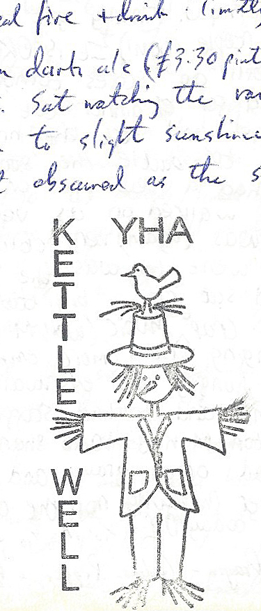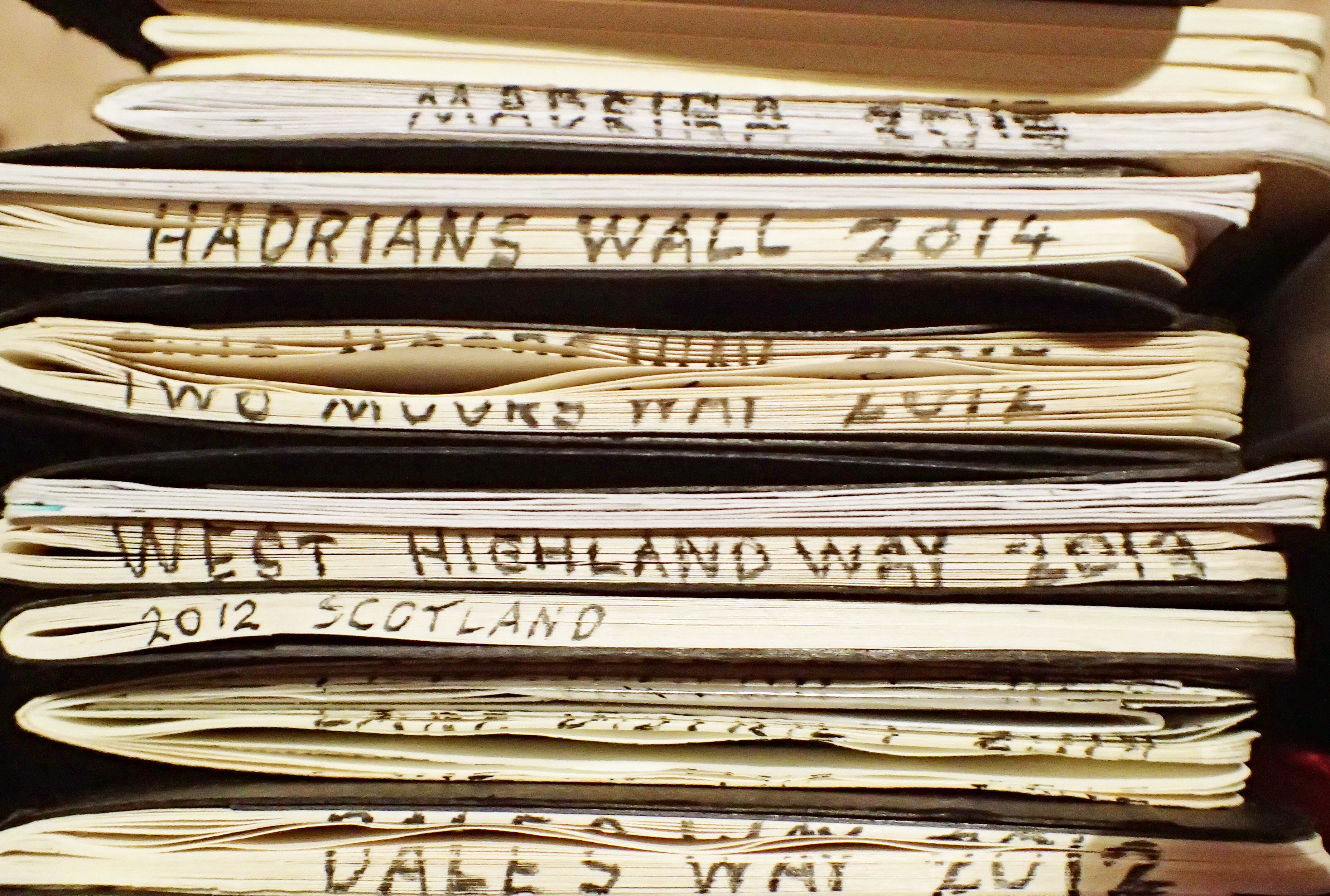 Scan-16_edited-2Scan-17_edited-1While it is possible to pick up a cheap little covered book for journalling for just a few pennies if looking in the right place. That will not necessarily hold up to much abuse, offer good quality paper or be of a size that is suited to what we want from a journal. I now prefer something more functional. Something that may actually look good even if what it contains is the demented ramblings of a fool. My own preference is usually for blank pages as this gives me the opportunity to include maps, scribbles, handstamps and, if feeling particularly inspired, a poor artistic rendering of a scene. I will also occasionally stick in ticket stubs and oddments picked up- feathers, leaves, flower heads etc to make the memories more vivid. Though my journalling is strictly amateurish compared to that created by some others. If you want to see the type of memories that can be put into a journal while hiking, have a glance at The Hike Guy, Kolby Kirk has done a great job of working found objects, rubbings, beer bottle labels, notes, paintings and much more into his journals.