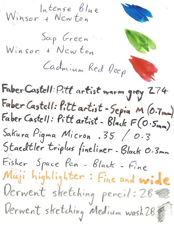 Leuchtturm1917 Whitelines. I did not like the dried watercolours at all, the grey undertone lent little and the colours are a little flat. Faber Castell pens did not take to the paper well but everything below those was OK with the exception of the medium wash pencil