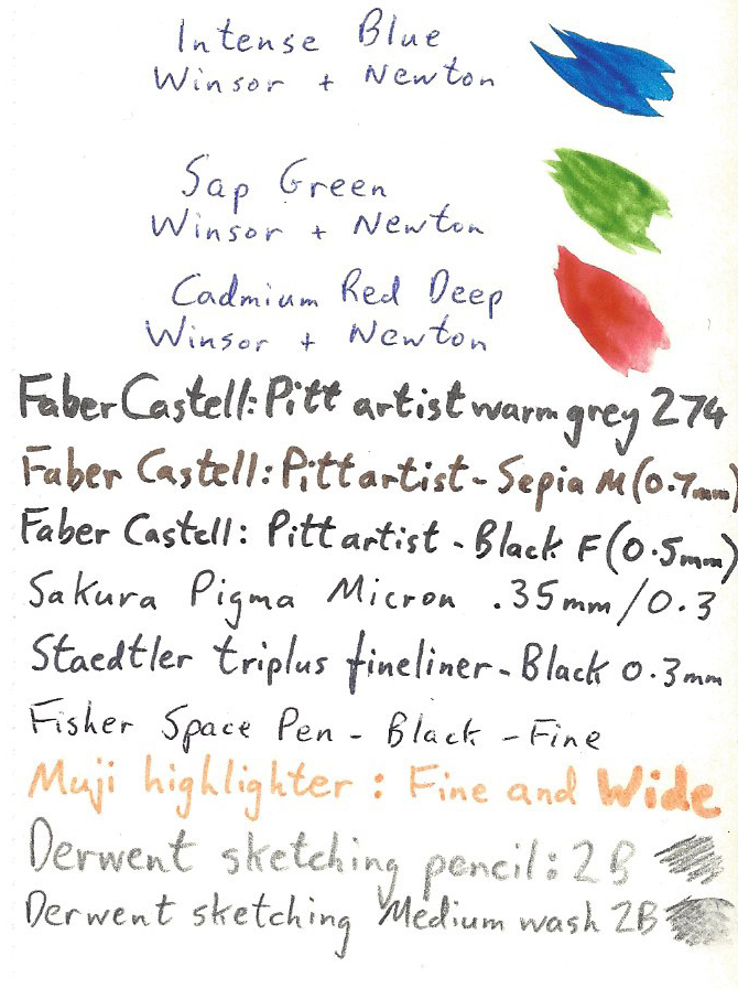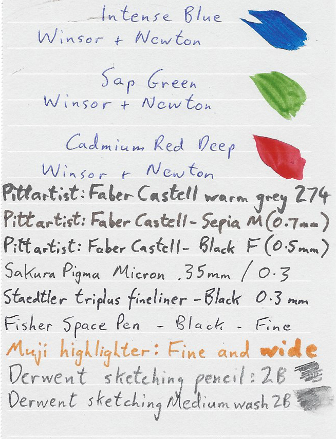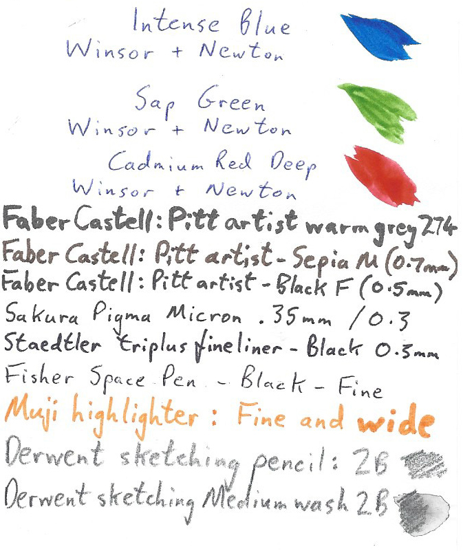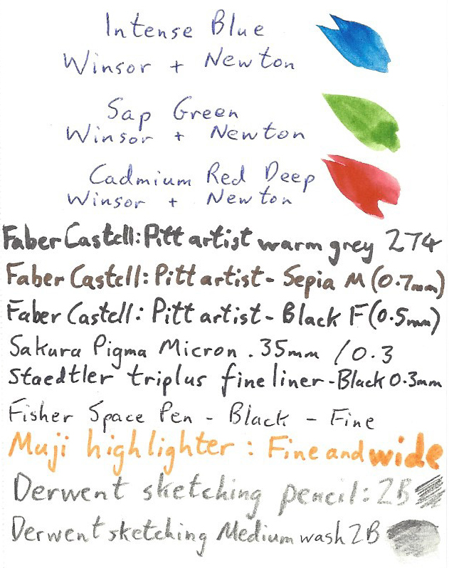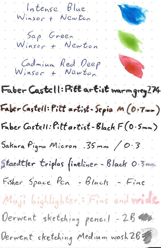 Taking a page from each of the notebooks, I have run a streak or two across of three colours from the Winsor & Newton watercolour range: Intense Blue, Sap Green and Cadmium Red Deep. These are followed by a range of pens including the brush pen from the Faber Castell shades of grey range. I also tried a small variety of pens and an orange highlighter, finishing off with two 2B pencils, the last being water soluble.