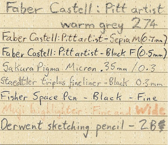 The paper handled all of my chosen pens and pencils well. Both 2B pencils felt good and the wash from the water soluble Derwent was even and dried well