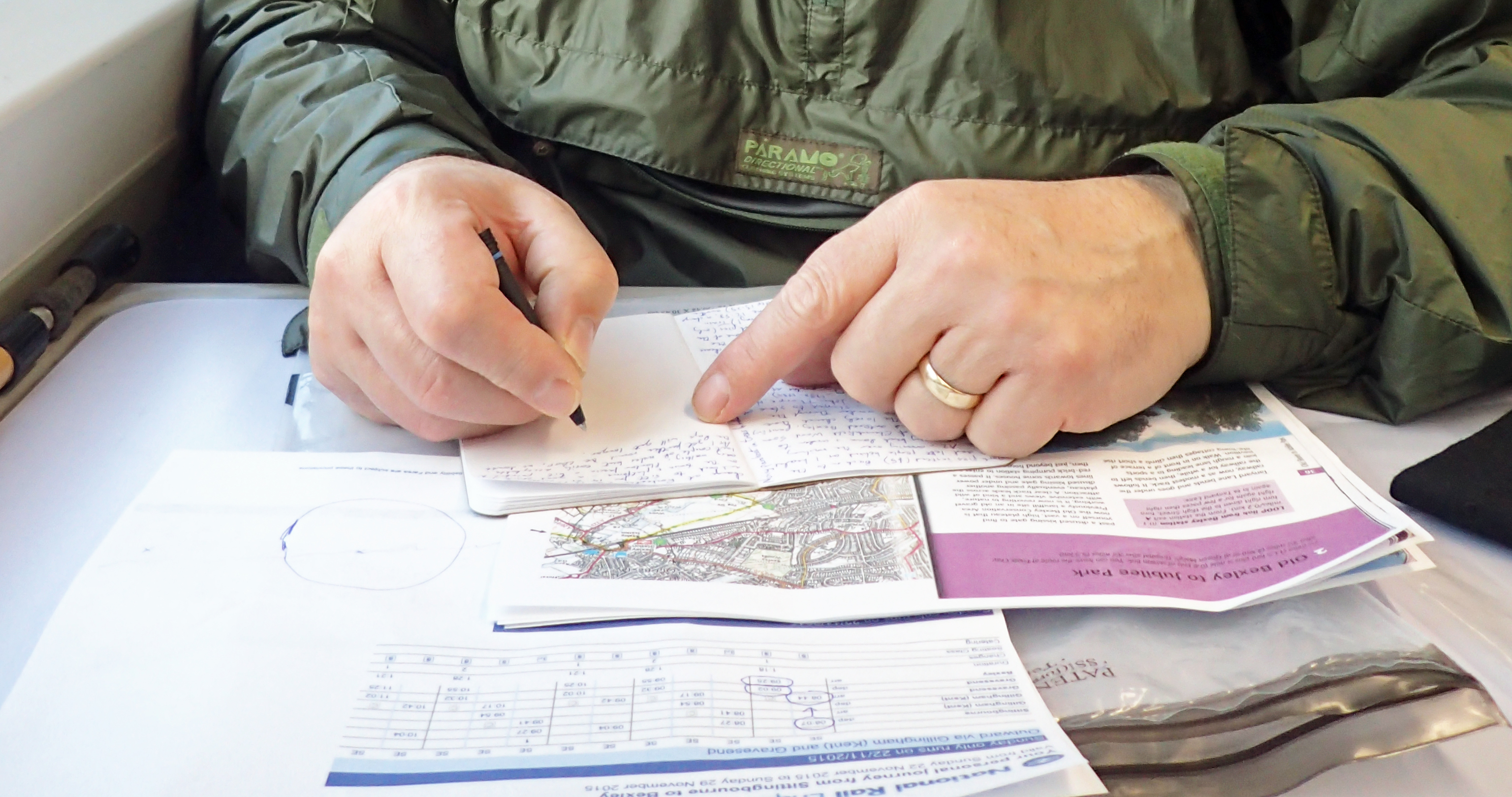 Catching up on my journalling on the train. Field Notes on return from a day on the London LOOP, November 2015