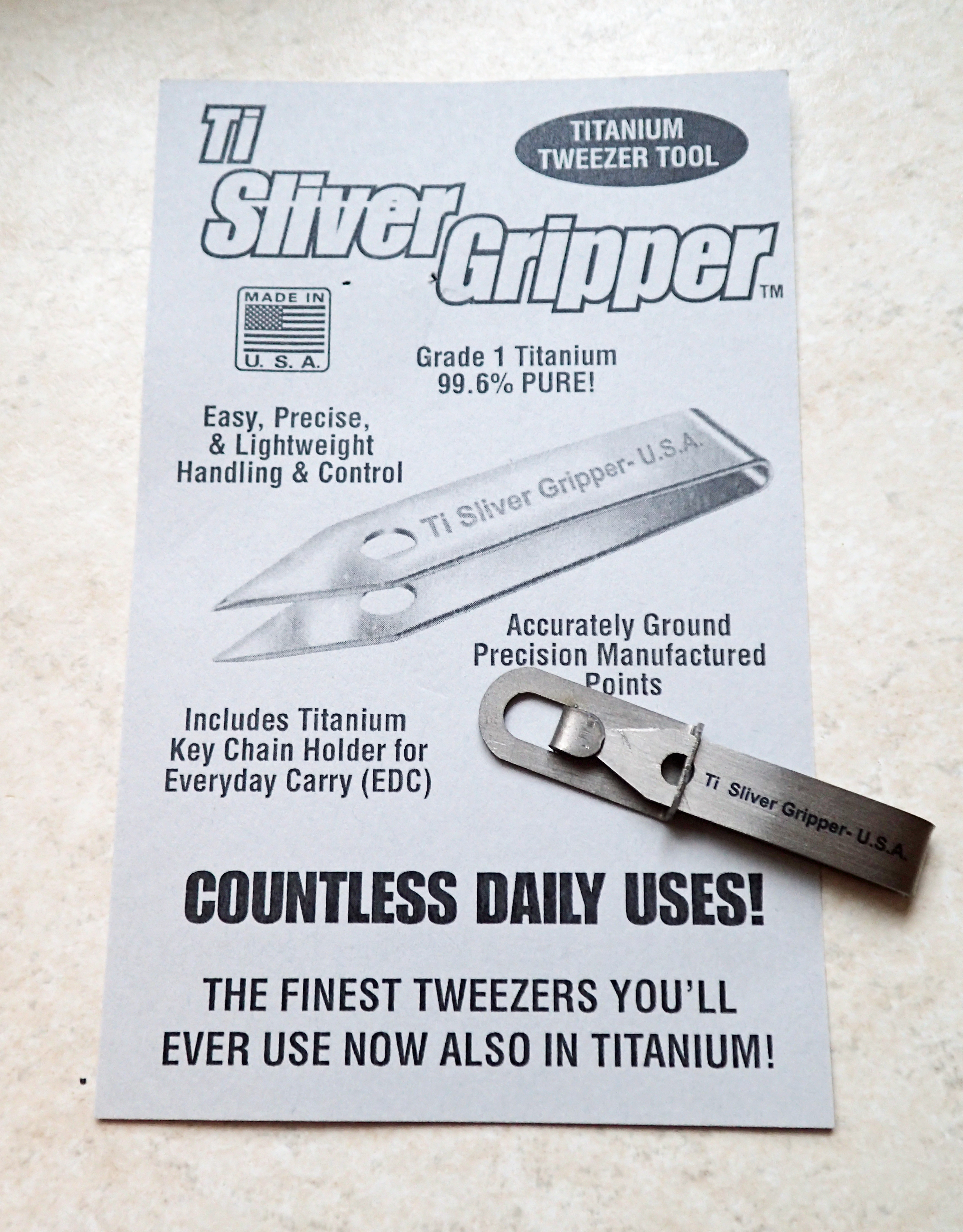 Small and lightweight titanium Sliver Gripper tweezers. With key chain holder, these weigh 4g and are very functional