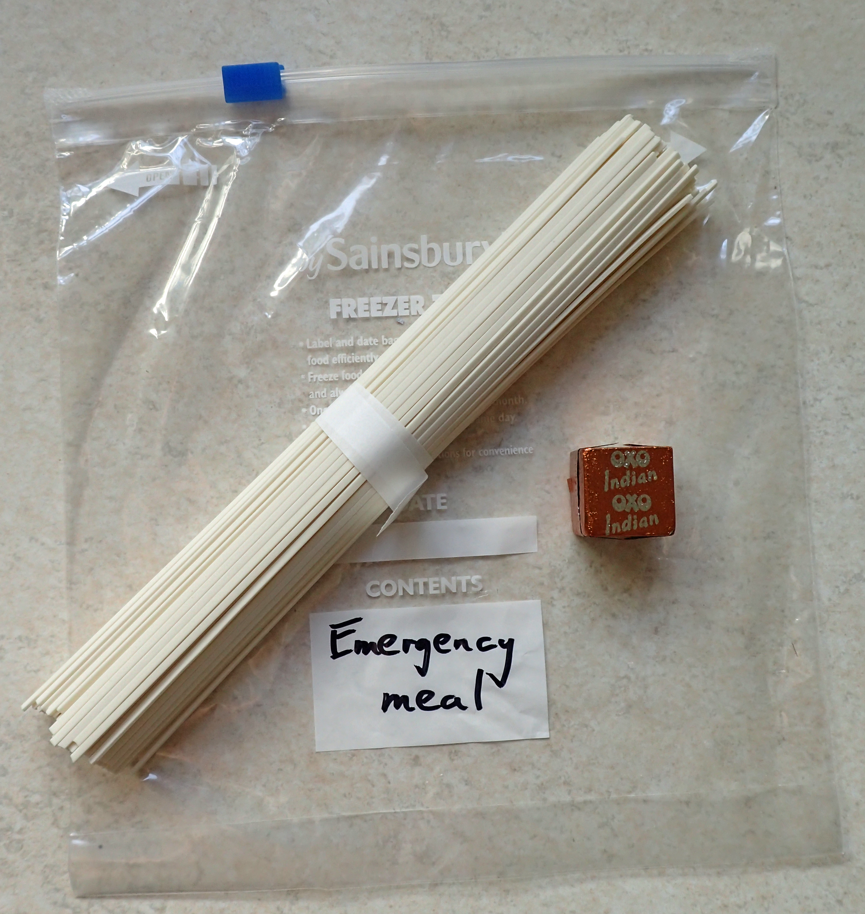 I may yet leave it out, but I am currently planning on including one reserve meal. This is simply a stick of ramen noodles and a curry flavour OXO cube.
