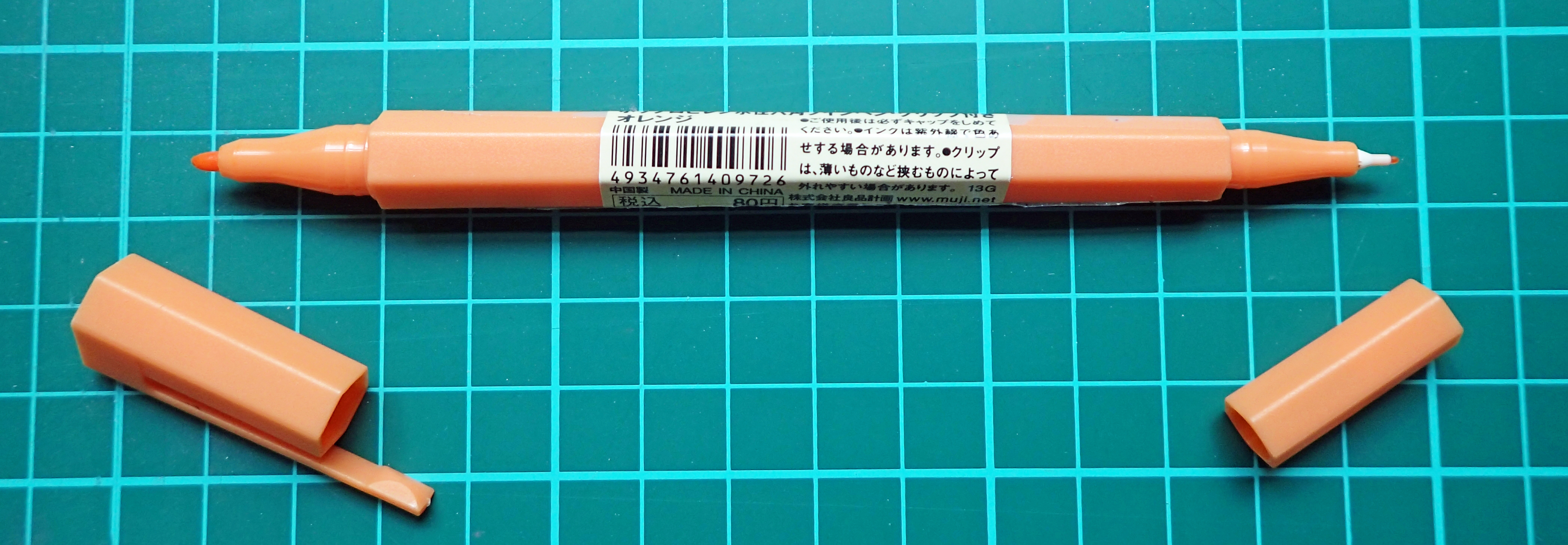 One last item I took along in my 22g Derwent pencil wrap was a 7g highlighter. This bright orange ink pen is made by Muji and features a thin nib at one end and a broader nib at the other. I use this for highlighting notes in my journal and for marking routes on maps. I notice that the design of these has changed since I purchased mine.