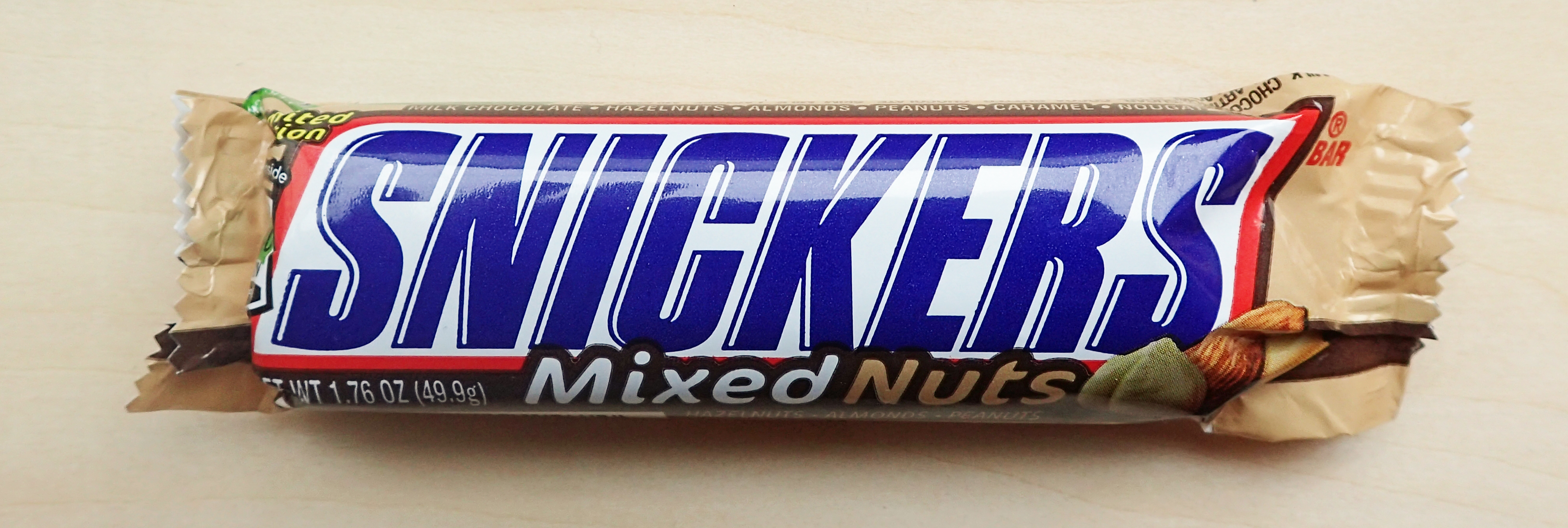 Snickers Mixed Nuts. 49.9g. 240cal. Photographed 2016. Peanuts, almonds, hazelnuts, caramel, nougat, milk chocolate. Fat 12g, of which saturates- 4g. Sodium 115mg, Sugars 26g, Protein 4g