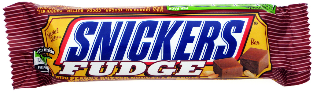 Snickers Fudge, 50g. 250kcal. 2009/10. No caramel in this, top half is of artery hardening fudge. Mini versions were also available, almost a health food, almost