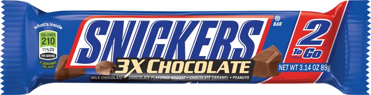 Note that the 3 x chocolate bar shown above is a ‘2 to go’ variant. Mars released a number of their Snickers bars in this format in 2012- There were regular Snickers, Snickers 3 x chocolate, Snickers Almond and Snickers Peanut Butter, though the last actually came as a 4 to go’ as the bars were already produced as small squares.