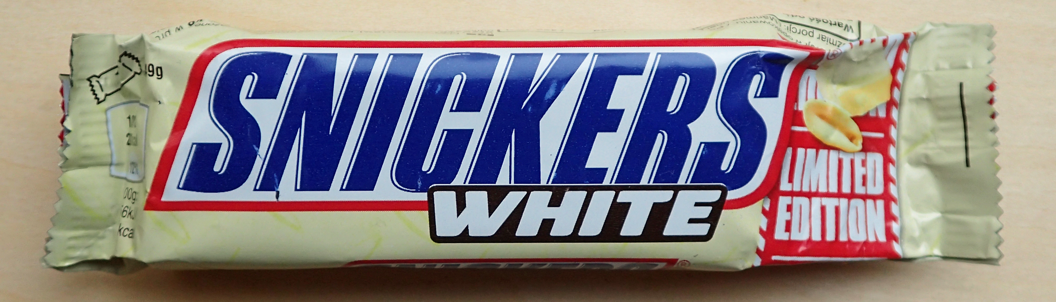 Snickers White. 49g, 241kcal. 2016. 1.8g fat of which 4.5 saturates. 29g carbohydrates of which 24.8g sugars. 4.4g protein with just 0.31g sodium