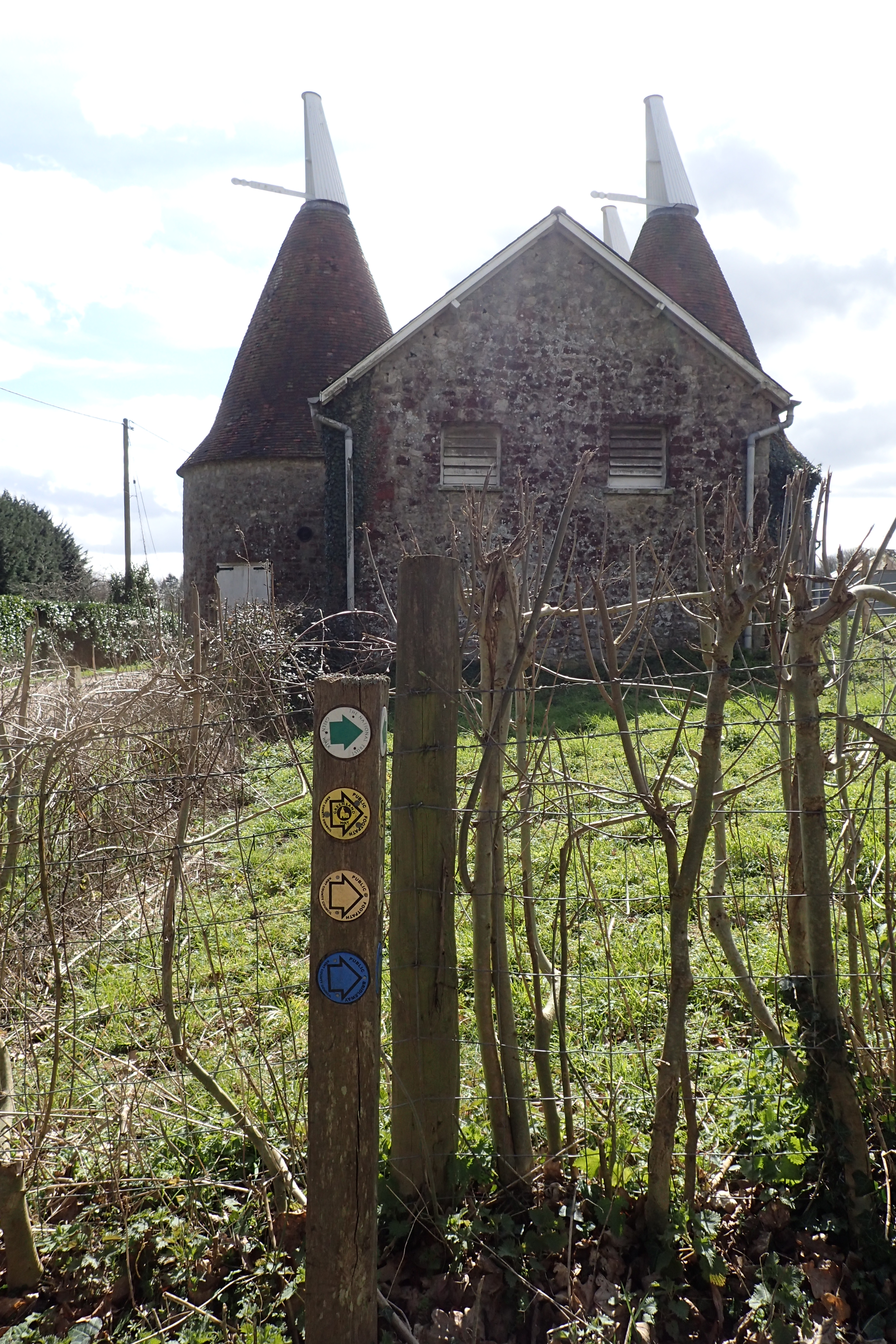 Passing three Oast Houses on the Greensand Way. If only I had a book from which I could learn more about them, Oh yes, I do…