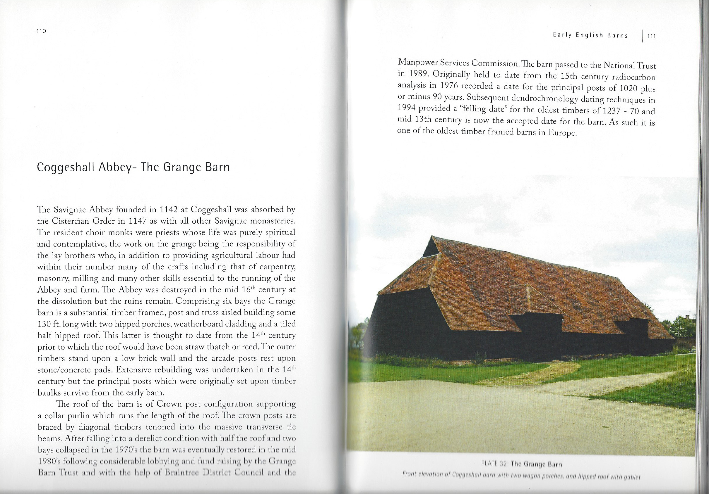 “When considering the medieval tithe barn or the monastic grange barn the grandeur of the structure, their sheer age and size, quality of the stonework, the intricacy of the timber framing, bulk of the posts and beams, complexity of roof joints, trusses, braces, rafters, collars and purlins clearly set them apart from other farm buildings… the structures are a monument to the skill of the carpenter and the mason and have stood the test of time”