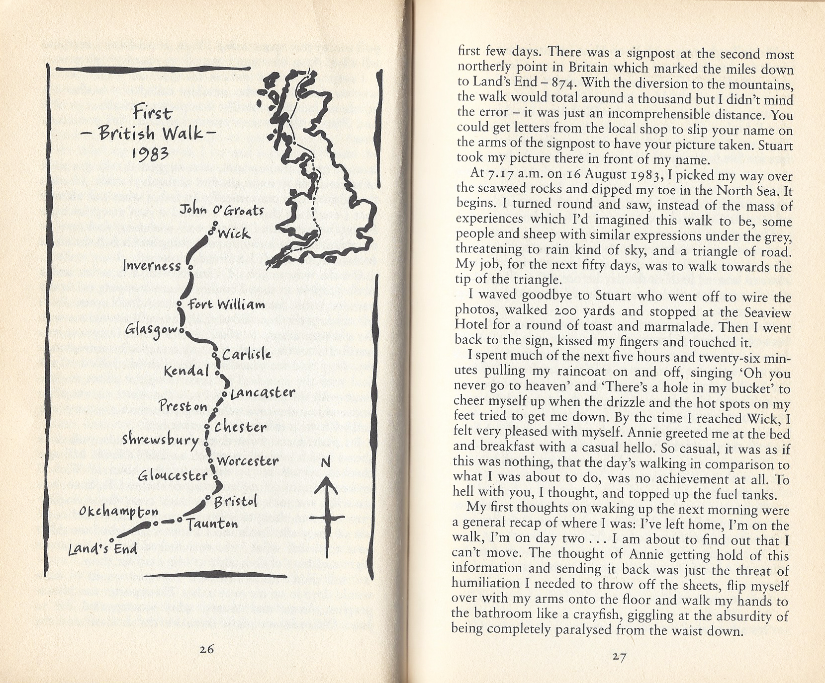 Two pages from the paperback version of Ffyona Campbell’s autobiography The Whole Story. Needless to say in a book that covers her global circumnavigation, her account of her walk from John O’Groats to Lands End at the age of sixteen is a small part of the book, covered in just eight pages including the sketch map