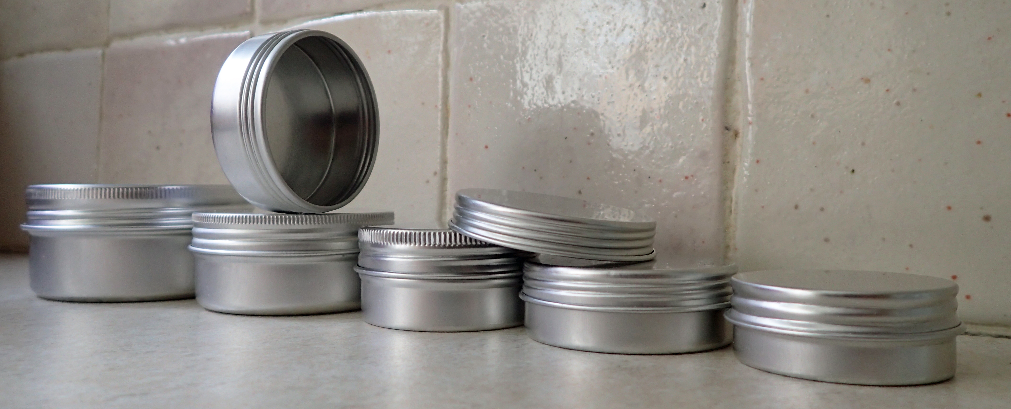 Small aluminium screw top tins are easily available online. These are just five of the many sizes on the market- 15ml- 4.5g, 25ml- 6.3g, 30ml- 7.6g, 50ml- 10.1g and 80ml- 14.3g. They can be easily dented and knocked around due to their thin metal, but still hold up well once the lid is screwed on