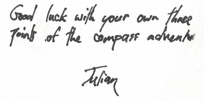 Julian joined me for a beer or two after his talk. We chatted about aspects of his adventures and we shared with each other some of our respective future plans. I looked forward to hearing of his account of courier work, which is recounted in his follow-up book Messengers. However I was more intrigued by his wish to hitch hike across his beloved USA. That 2013 adventure was written about in his book Interstate, that won the Stanford Dolman Travel Book of the Year. As to my future Long Walk, he was kind enough to annotate my copy of Life Cycles…