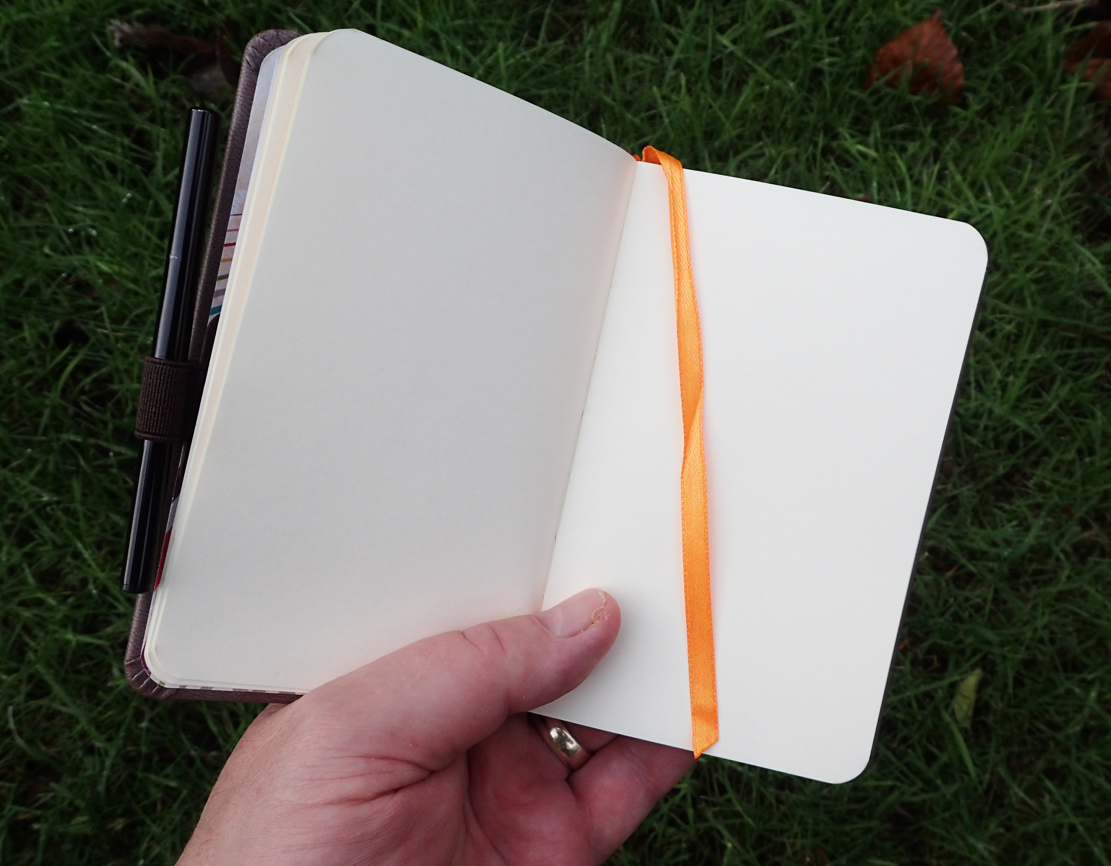 There is a small gusset pocket in the rear of the notebook, a single ribbon marker and elastic closure. These notebooks come in a wide range of colours but I have chosen the chocolate colour coupled with a tobacco coloured self-adhesive pen loop. The three items- journal, pen loop and pen weigh 161g. Not light, but it is important to me to create a long lasting record of such a trip. Replacements can be sent to me periodically on trail as required.