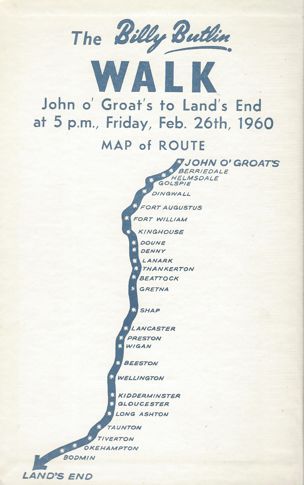 Partly inspired by the achievements of a slightly odd woman- Dr. Barbara Moore, in February 1960, the South African born, British entrepreneur Billy Butlin, called a conference of a dozen or so of his organisation’s managers. Many of these worked on his popular and affordable holiday camps. Ever alert to the potential for self-promotion, he announced his intention to stage a race- open to all, it would be a ‘walk to end all walks’ from John O’Groats to Land’s End.