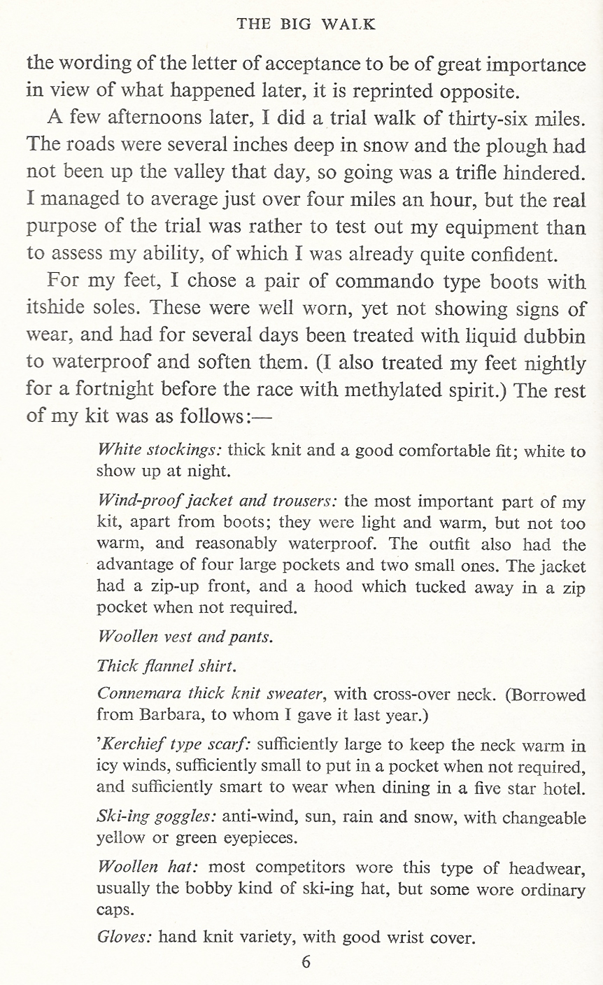 The kit list of the author of The Big Walk during his 1960 endeavour makes interesting reading. Note the ‘kerchief type scarf, sufficiently large enough to keep the neck warm while being smart enough to wear while dining in a five star hotel. For protection from the weather, he wore an ex-army gas cape. His choice of footwear proved disastrous as his feet swelled so much he couldn’t get them on. He was forced to wear a pair of Alpine boots with the tops from a pair of sandals stuffed into the sole- “this was the answer I had been looking for and was most successful”