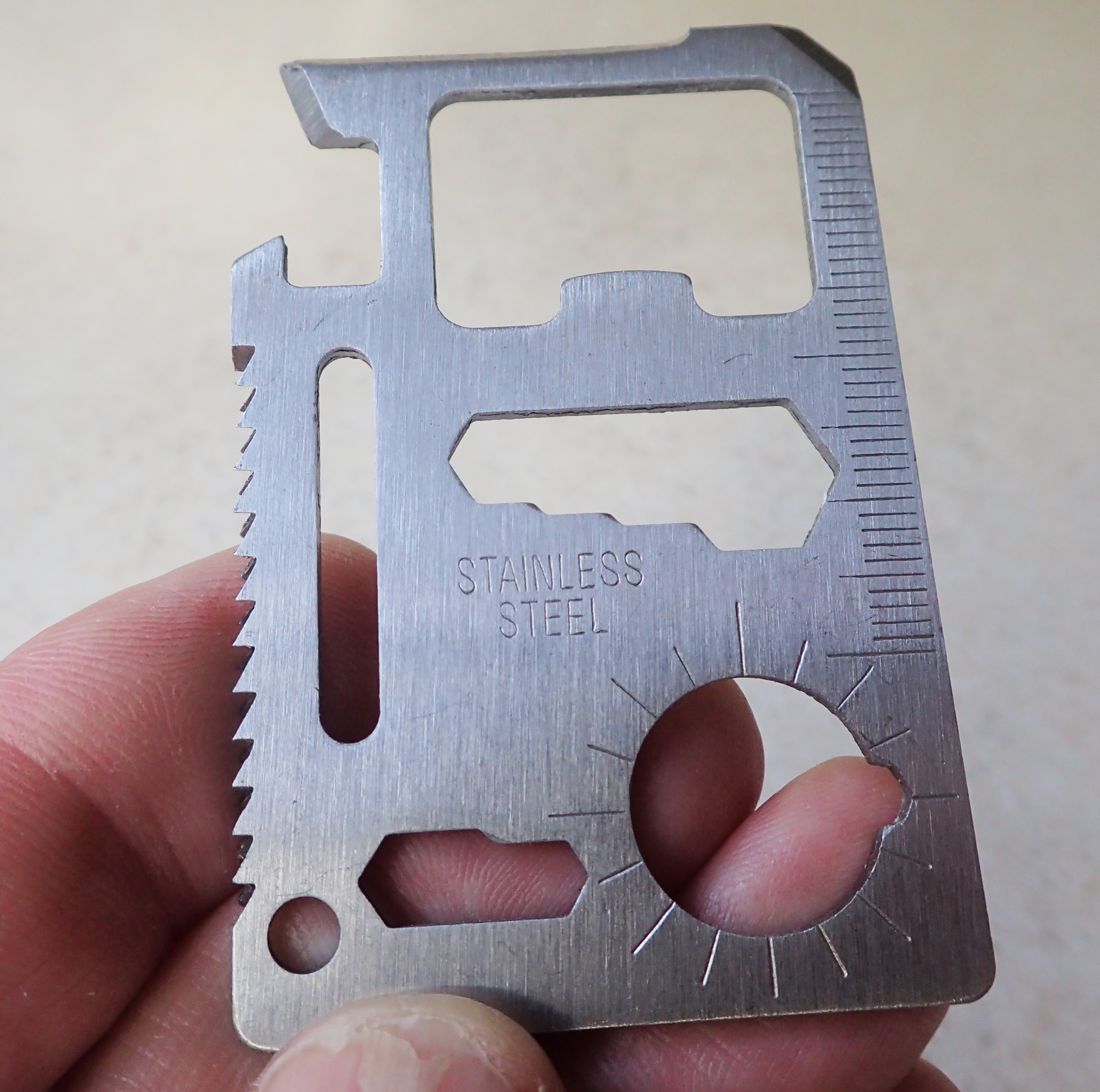 Stainless steel pocket tool from BCB. This probably dates from the 1990s and is a better credit card sized tool than the cheaper copies that followed. Despite that, it has been supplanted by more useful pocket tools today