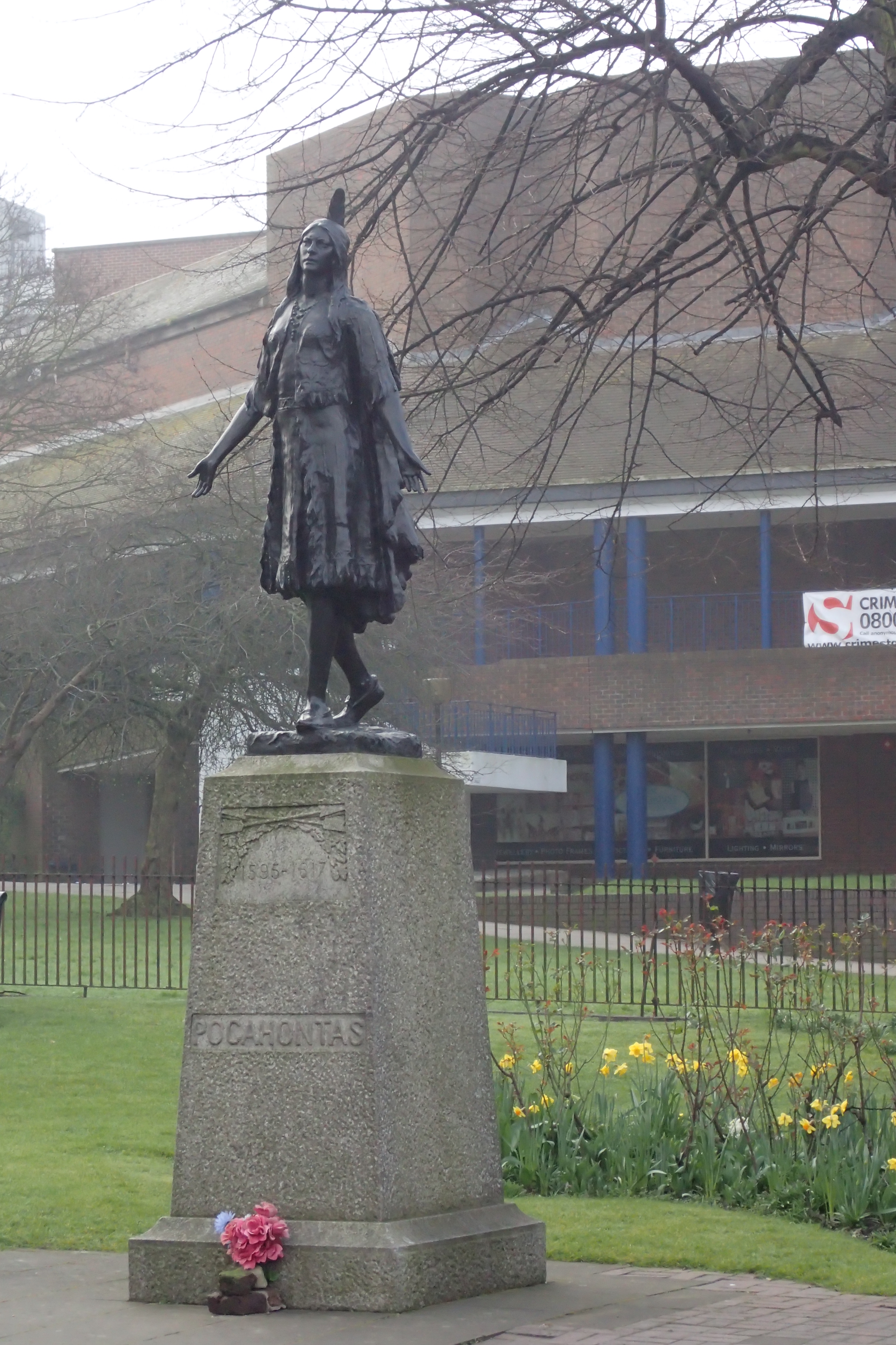 The statue of native American Pocahontas and her memorial are seen on the final day on trail at St. George’s Church, Gravesend