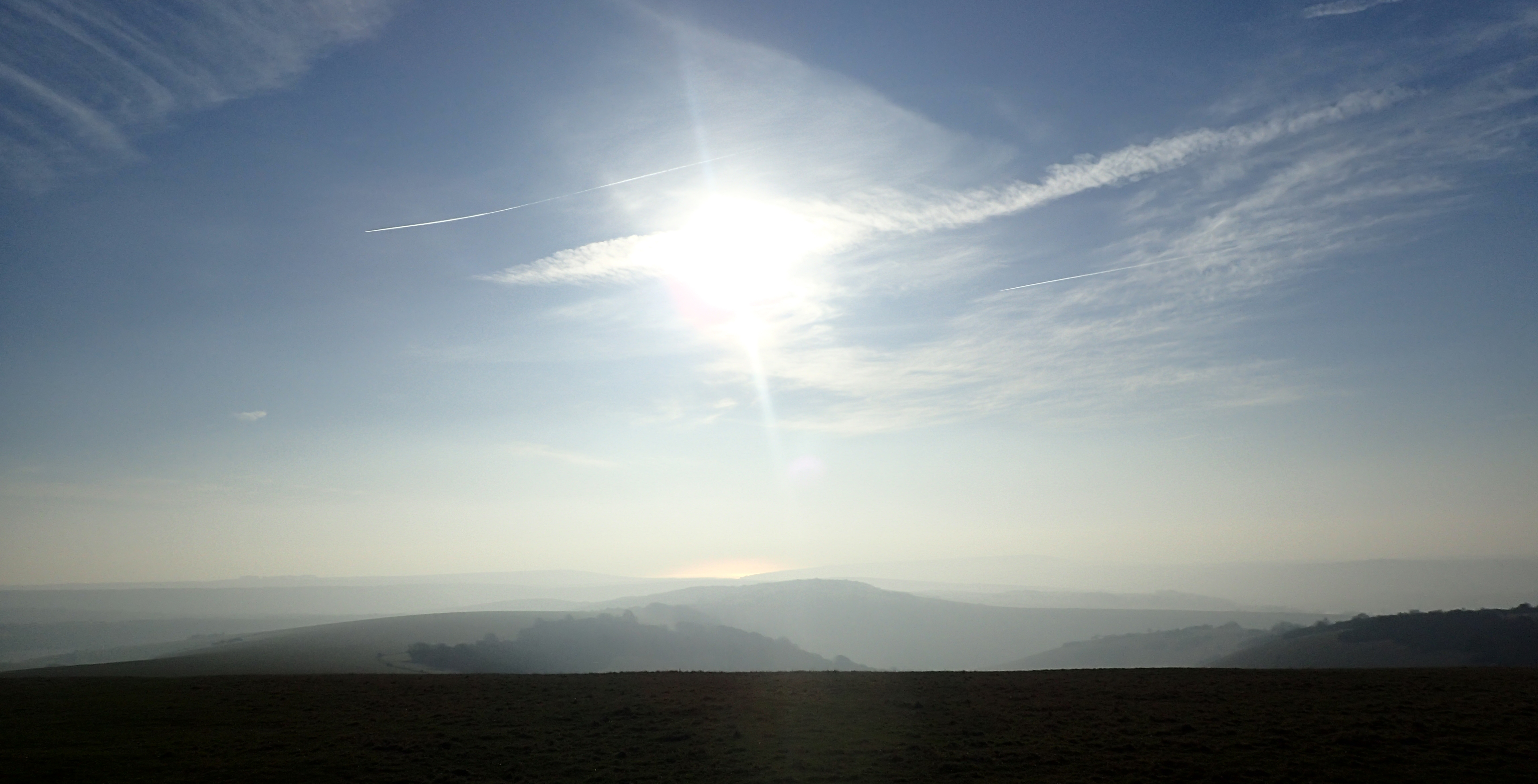 Looking south from atop the South Downs, the English Channel can just be seen on a misty cold morning