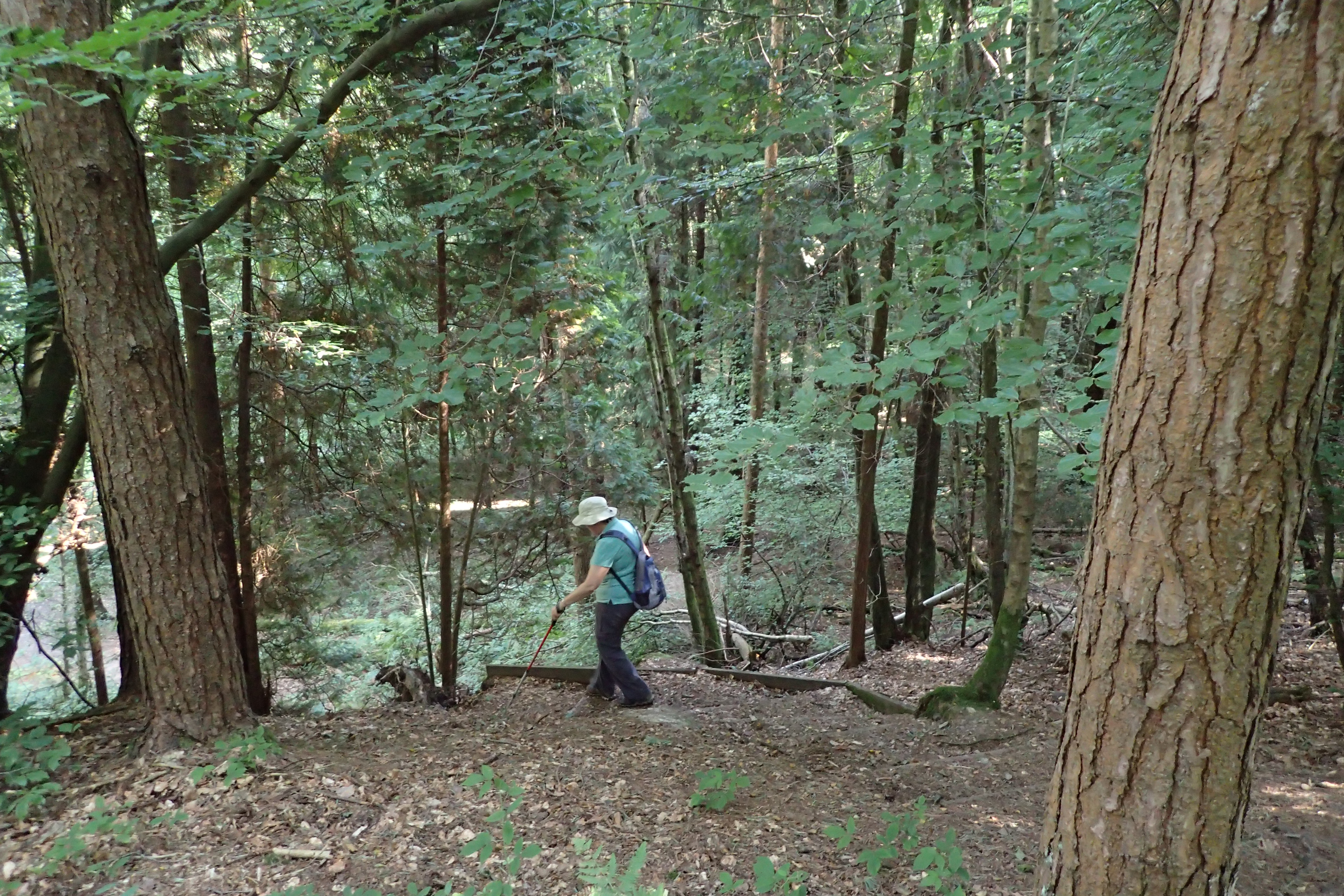 Mrs Three Points of the Compass makes a short descent through a small mixed woodland to cross one of the many streams encountered on the Wealdway. The proliferation of both water and wood meant that it was this region that supported the first iron workings in the country
