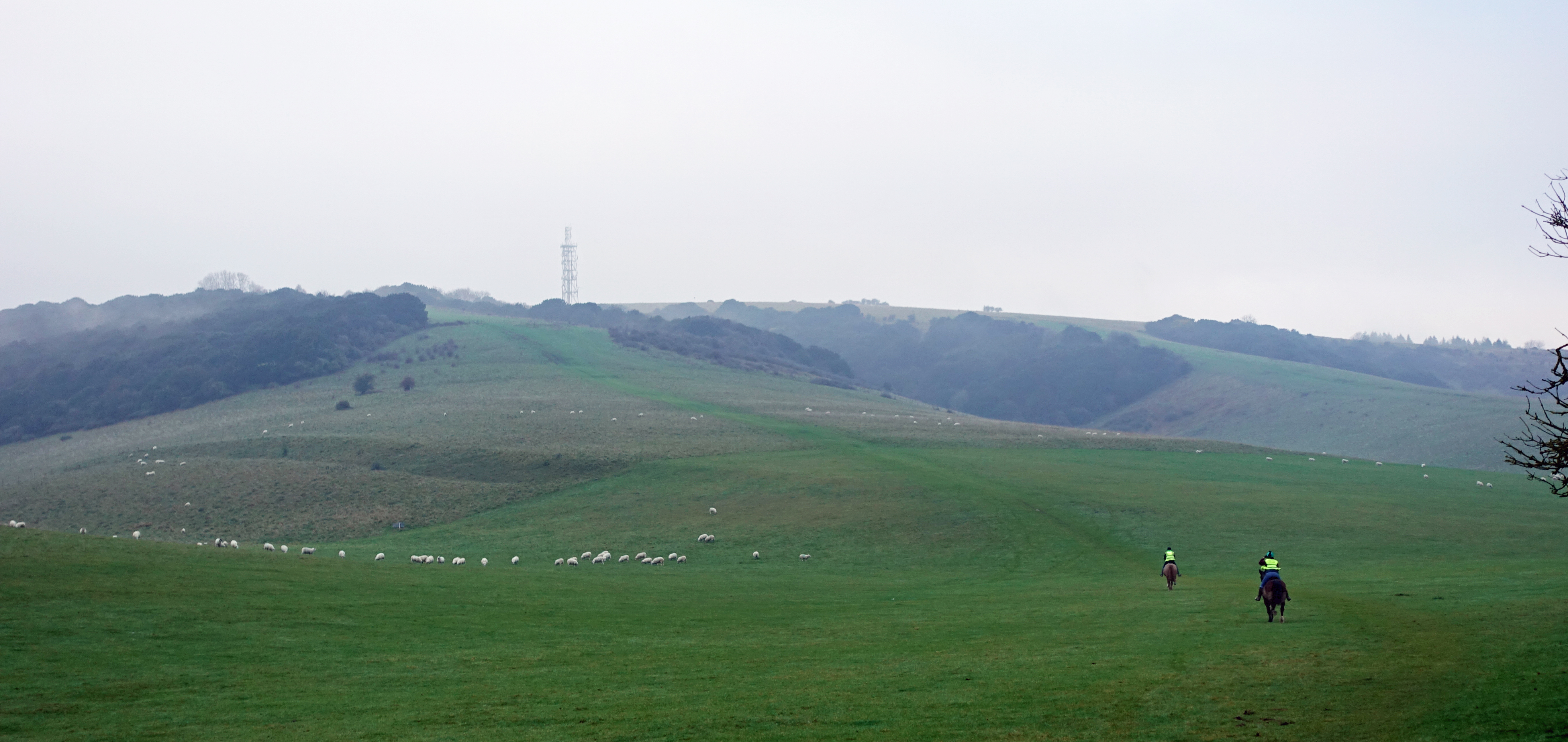 I slept well, the campsite was silent beyond a few owls, a mouse rustled through my rubbish bag outside but cleared off when I muttered at it. I rose at five as I had a twenty four plus mile day to complete to where I hoped to wild camp that night. The temperature had dropped considerably and I was pleased I had bought a full set of insulated clothing as camp wear. Quite a bit of condensation on the inner surface of the shelter, nothing within the nest however. I wiped this down while the tawny owls set off again, breakfast, ablutions, packed and away prior to seven. A bit later than I had hoped but I frequently faff around a bit too much on my first morning. It wasn’t long before I was into the Queen Elizabeth Country Park. it was good walking through the wooded park until the wonderful long and sweeping descent down to the crossing of the A3. I held a gate open at the bottom for a couple of horse riders who after thanking me, set off at a fine gallop up the slope toward the ancient field systems below Butser Hill that were very evident that morning with the misty low sun and long shadows.