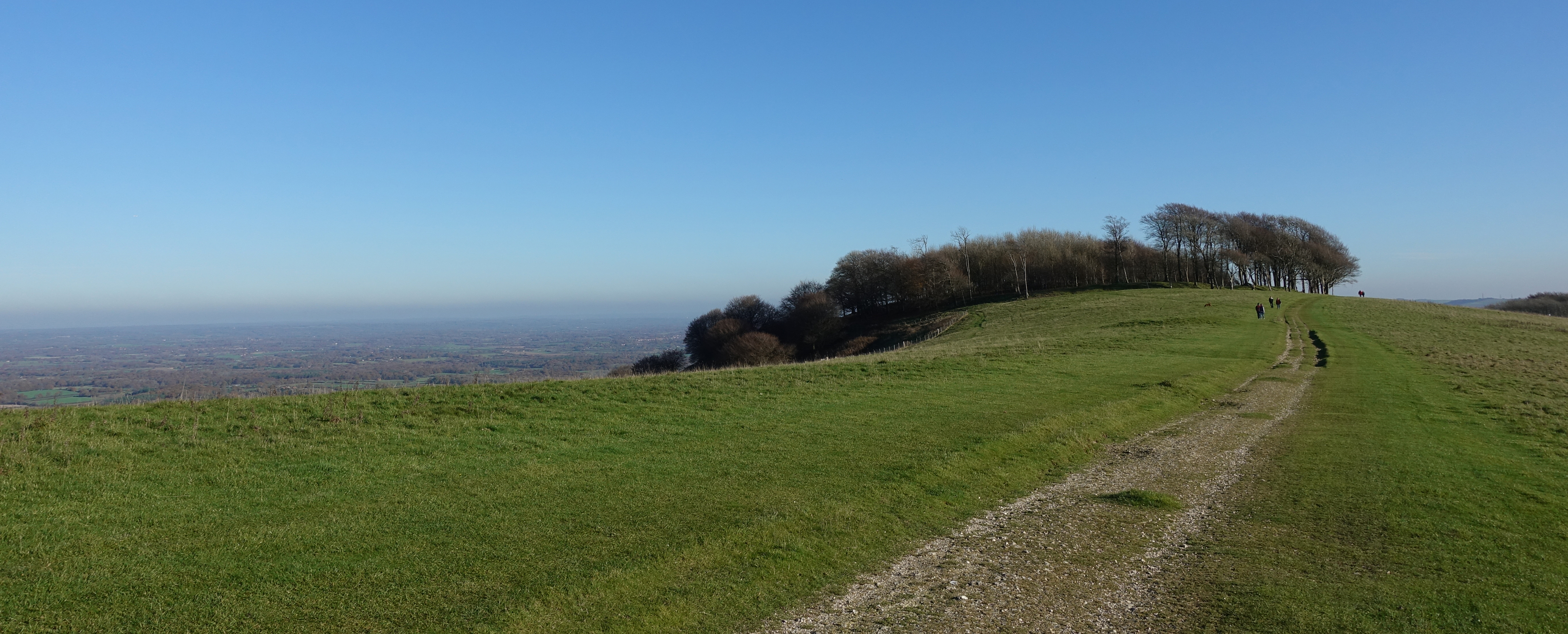 Approaching Chanctonbury Ring. A feature of the South Downs, it is visible for miles to the north and south. The original ring of trees, long since replaced, were planted on the site of a prehistoric hill fort