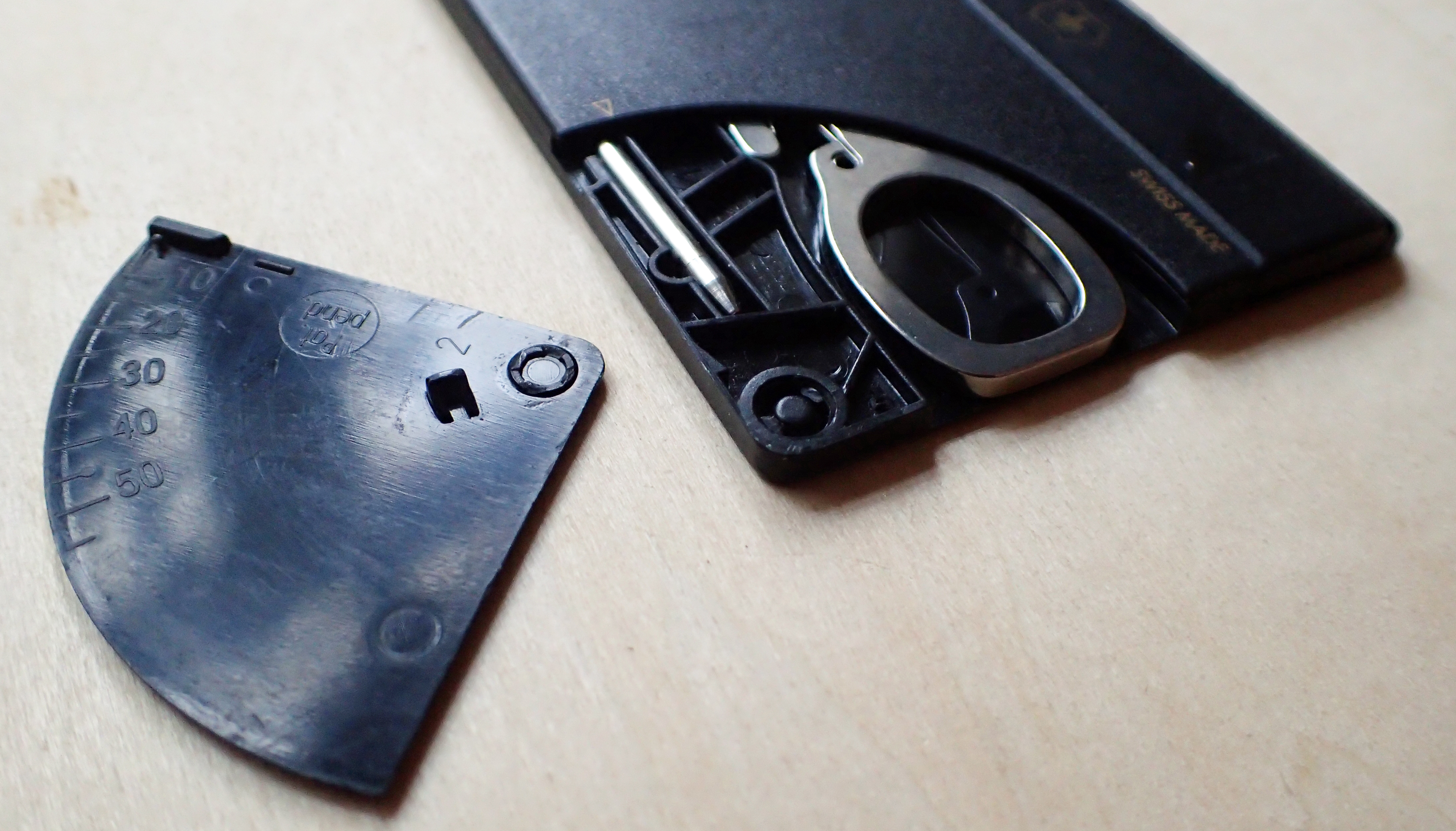 The first two generations of the SwissCard weighed 26.2g, this weight increased imperceptibly to 27g when the sliding door was excluded from the design with the third generation. This meant that the protractor on the second generation was now also removed as a result. While the protractor on the second generation SwissCards could possibly be used for measuring snow slope angle, and the likelihood of avalanche, I really can’t see this being carried out in reality. The third generation of the plastic case is much sturdier and robust as a result of the change.