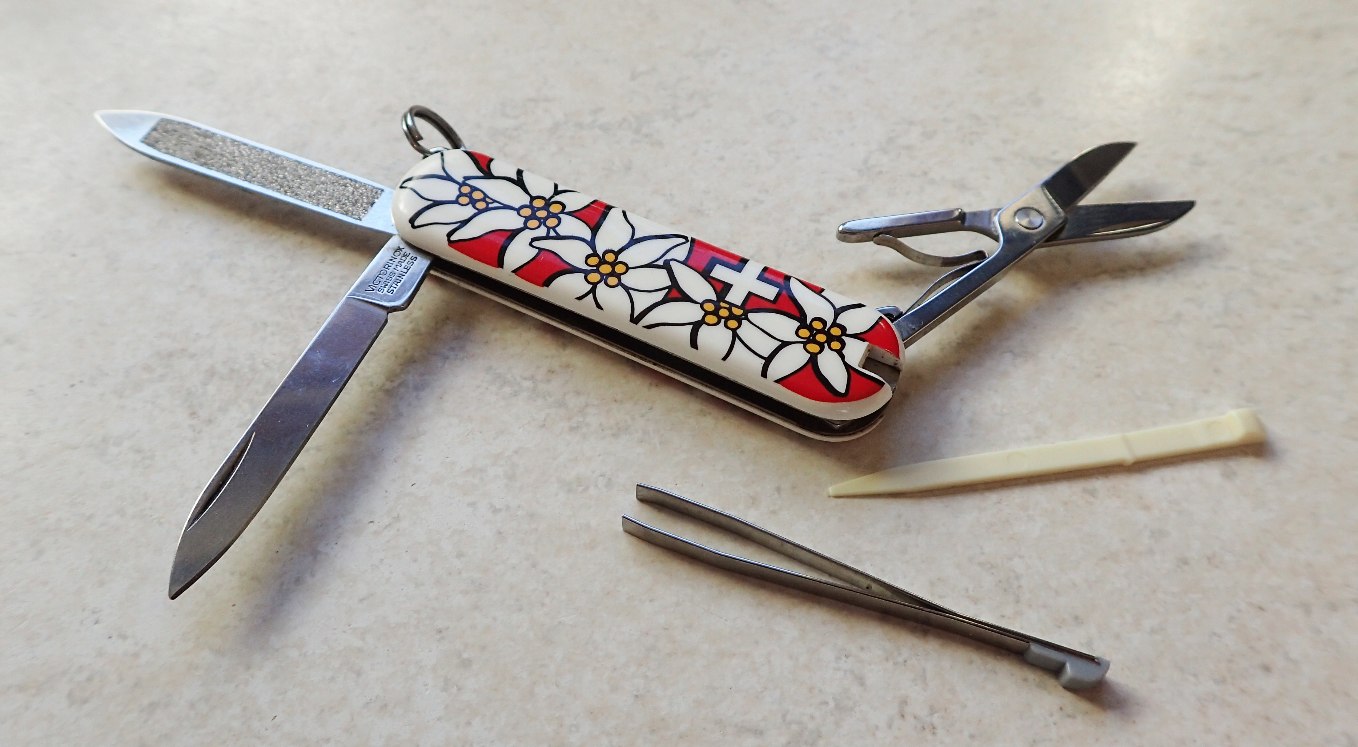 The 21.3g 58mm Victorinox Classic has a similar set of tools to those found in SwissCards. This is the Edelweiss scaled version, there is a huge variety of scale designs found with these knives