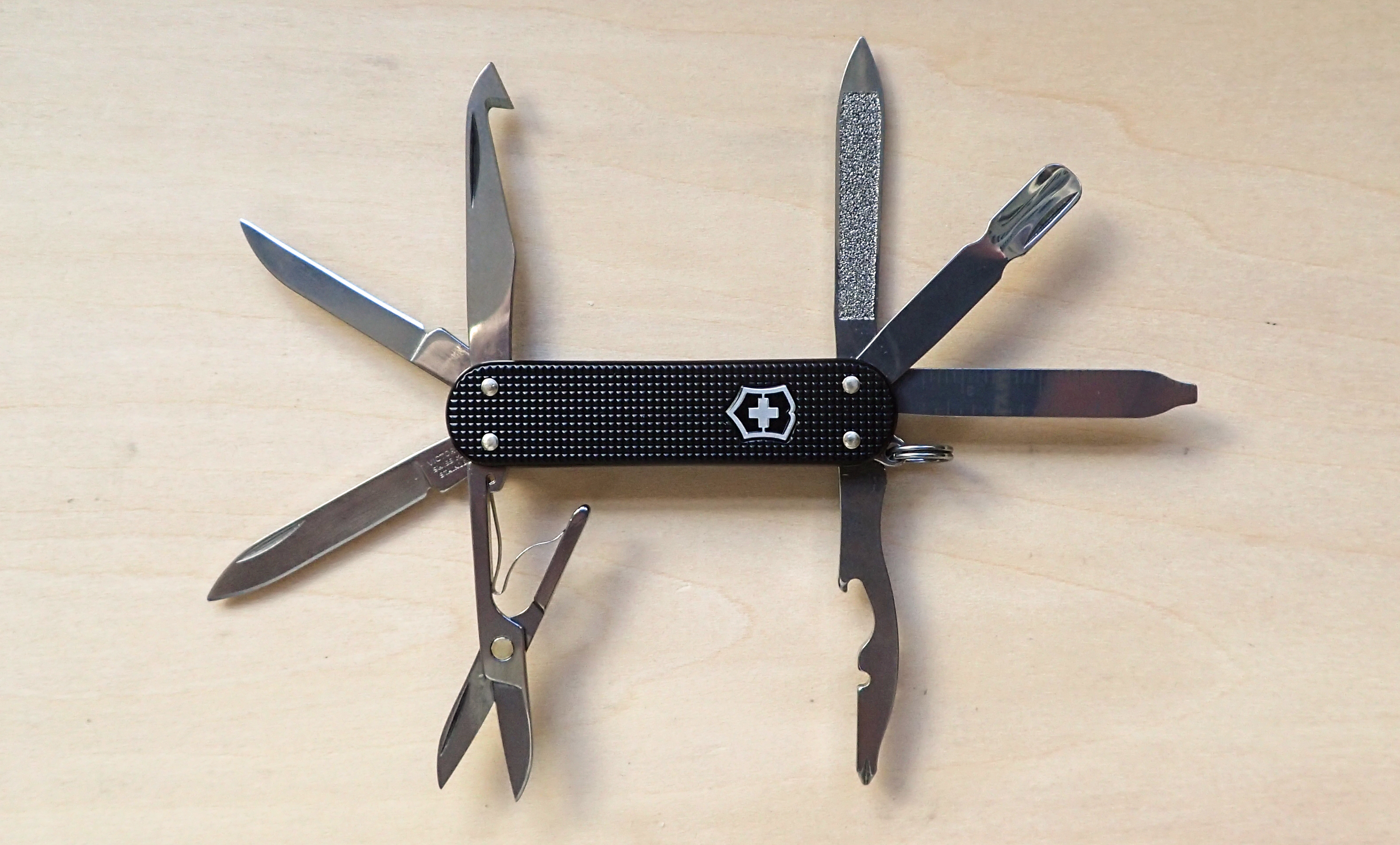 The later version of the MiniChamp (originally known as the MiniChamp II while the MiniChamp I was still available) built on the previous model by including Victorinox’s remarkably useful combination tool that includes cap lifter and magnetised Phillips screwdriver with a less useful wirebender/stripper. This is at the expense of it widening still further to become, at 14.8mm, the only five layer 58mm knife in the Victorinox stable. While it comes with a set of tweezers installed, one of the useless toothpicks is packed in the box should you feel a burning need to trade out something useful for something considerably less so.
