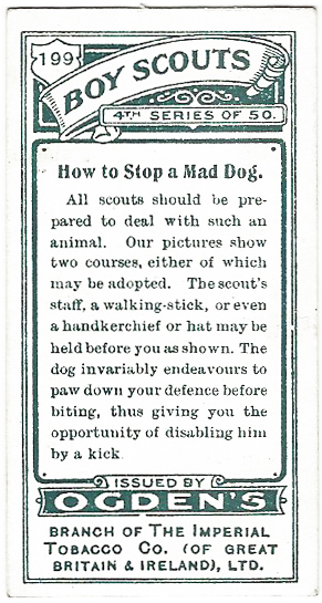 Around a century ago, this Ogden’s cigarette card gave sage advice to Boy Scouts and others, stating that staff, walking stick, hat or handkerchief should be held in front, as the dog paws this down this gives “opportunity of disabling him by a kick“. I can imagine the outcry if such advice were circulated widely today. There are a few other ploys that it is worth considering, or being aware of.