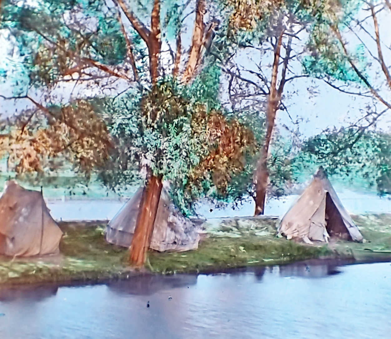 Camping by boat on the River Thames, possibly Eel Pie Island. c1900. Coloured lantern slide