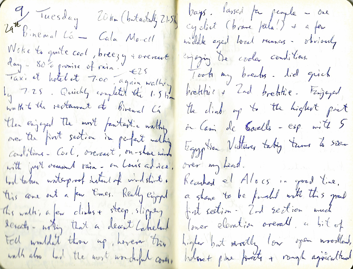 I didn’t spend time on trail looking out for cafes, they simply aren’t there when you want one, other than while waiting for a bus on occasion. Lunches were simply a roll or two, meats (Ses Tanques) and cheeses (Queso de Mahon) from a local supermarket plus a few nuts. Hydration is another matter. This is a dry island with no rivers and it is very unlikely you will find water should you run out. I carried a minimum of two to three litres with me each day, occasionally more, and still ended up purchasing water in town shops toward the end of a day’s hike.