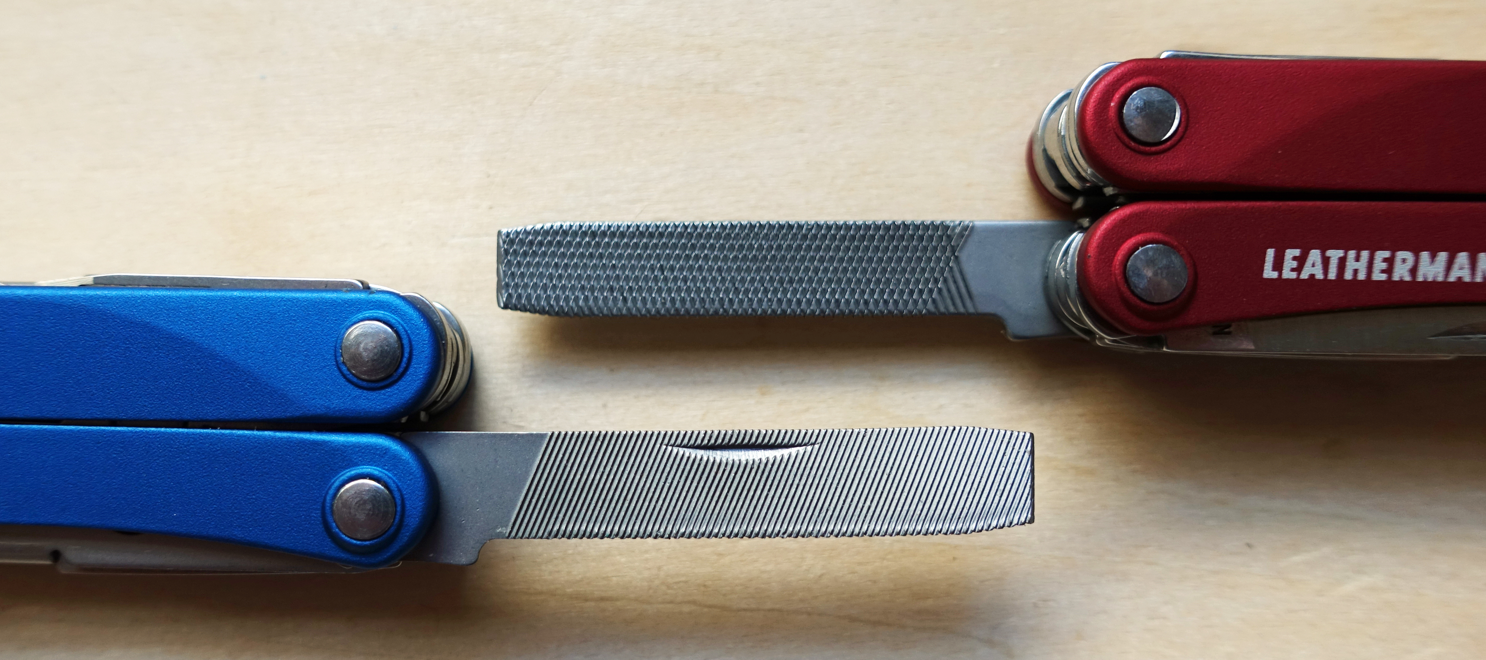 The two sides of the files found on the P4, E4, PS4 and ES4 Squirts compared. You can see the toothed edge to the file that can be used for notching wood, sawing plastic and not much else. Each of these tools has both file surfaces