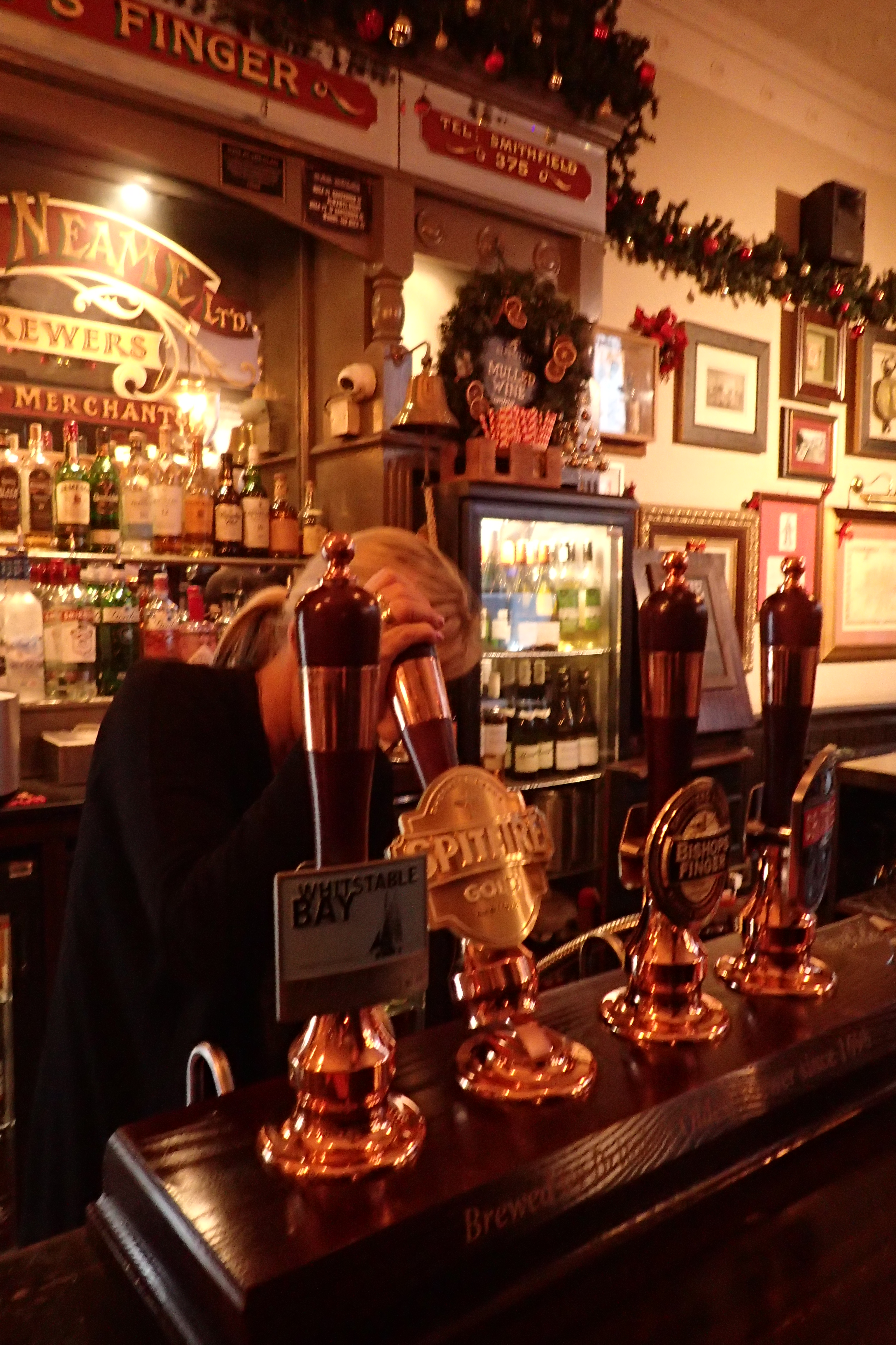In March 2019, Shepherd Neame introduced their Cask Club beers- these are monthly cask ales that celebrate modern styles alongside international collaboration in brewing. The November 2019 offering was Howling Wolf. This 4.5% beer is brewed with Finnish brewer Mallaskoski. Brew Master Jyri Ojaluoma left Seinäjoki in northern Finland to visit Faversham over two days to work on the result. It has bags of taste and a deep smokey finish, just right for a winter ale. Scandinavian Viking Red malt helps deliver the dark colour alongside American, German and English Mittelfruh and Summit hops. I was pleased to catch this ale as it is a style I prefer over the cask club beer to be offered the following month- Rudolph’s Reward, a 4.5% a ‘Festive Light Ale’. It made for a great start to my day. We told our server Sophie of our endeavour and she excitedly wished us well.