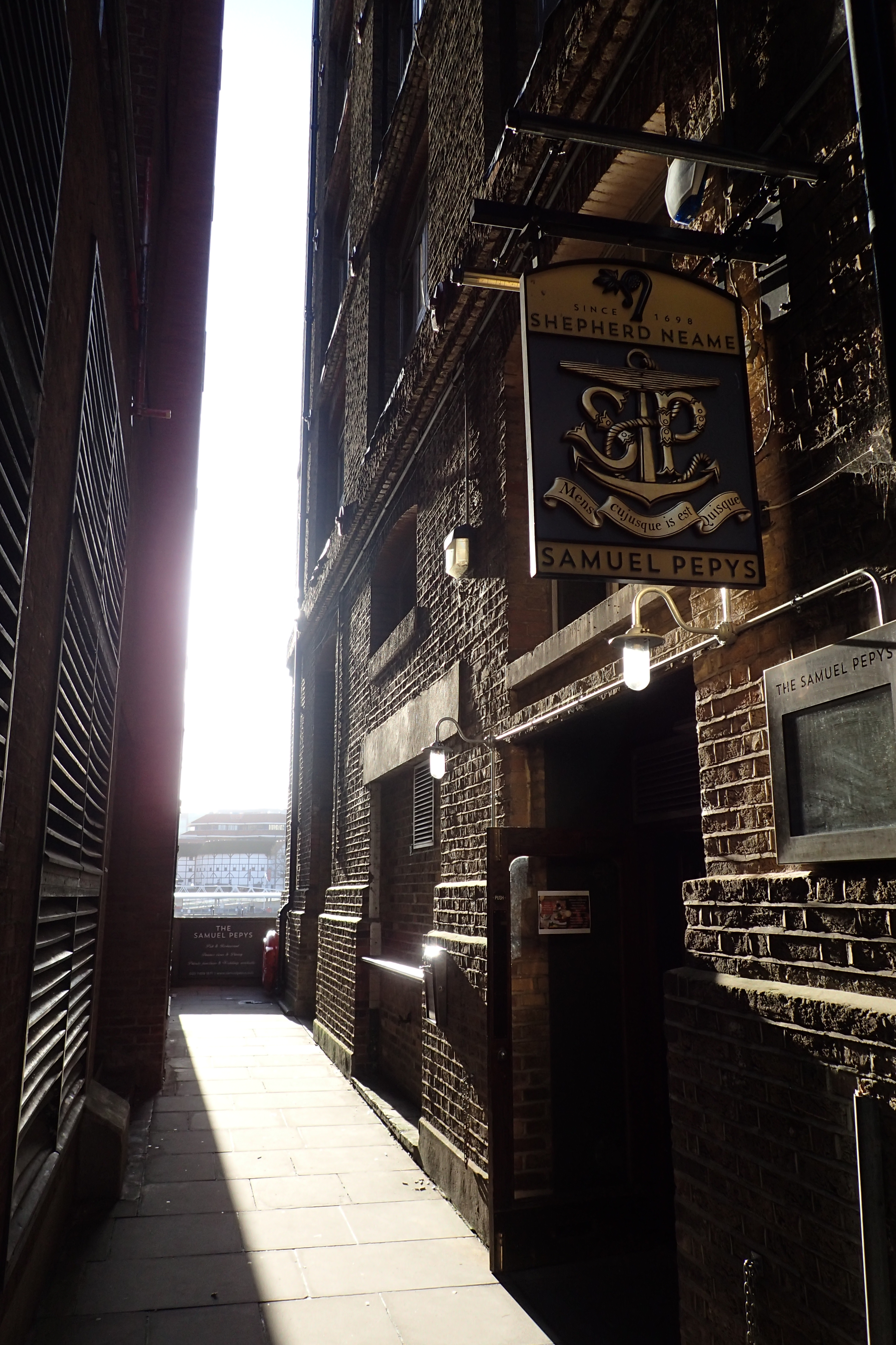 The Samuel Pepys. Housed in a nineteenth century former tea warehouse hard against the River Thames. The Pepys family coat of arms is shown on the pub sign