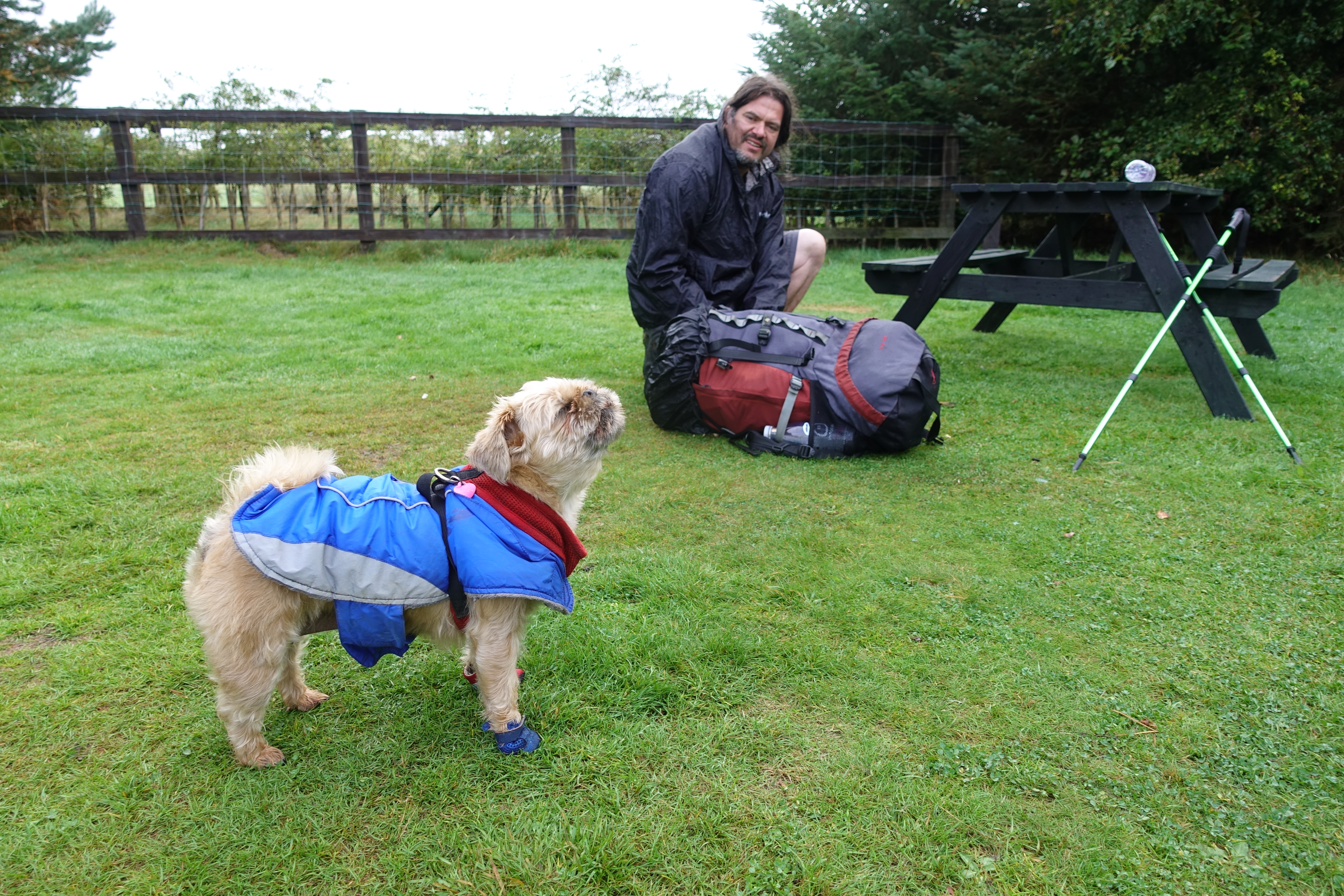 I was abed by ten and slept well before rising at six thirty. I had ordered a cooked breakfast so that I could set off well-fortified but this was barely adequate fare. Made up for by my snaffling a breakfast banana and some mini cheeses for later. I still didn’t manage to set off until eight thirty. Walking back through town, the Saturday morning was sunny and sleepy with few people, mostly the odd dog walker. Two of whom were kind enough to pause and take my obligatory ‘start of trail’ photo. Out of town and immediately on to good grassy paths, a few gentle ups and downs.