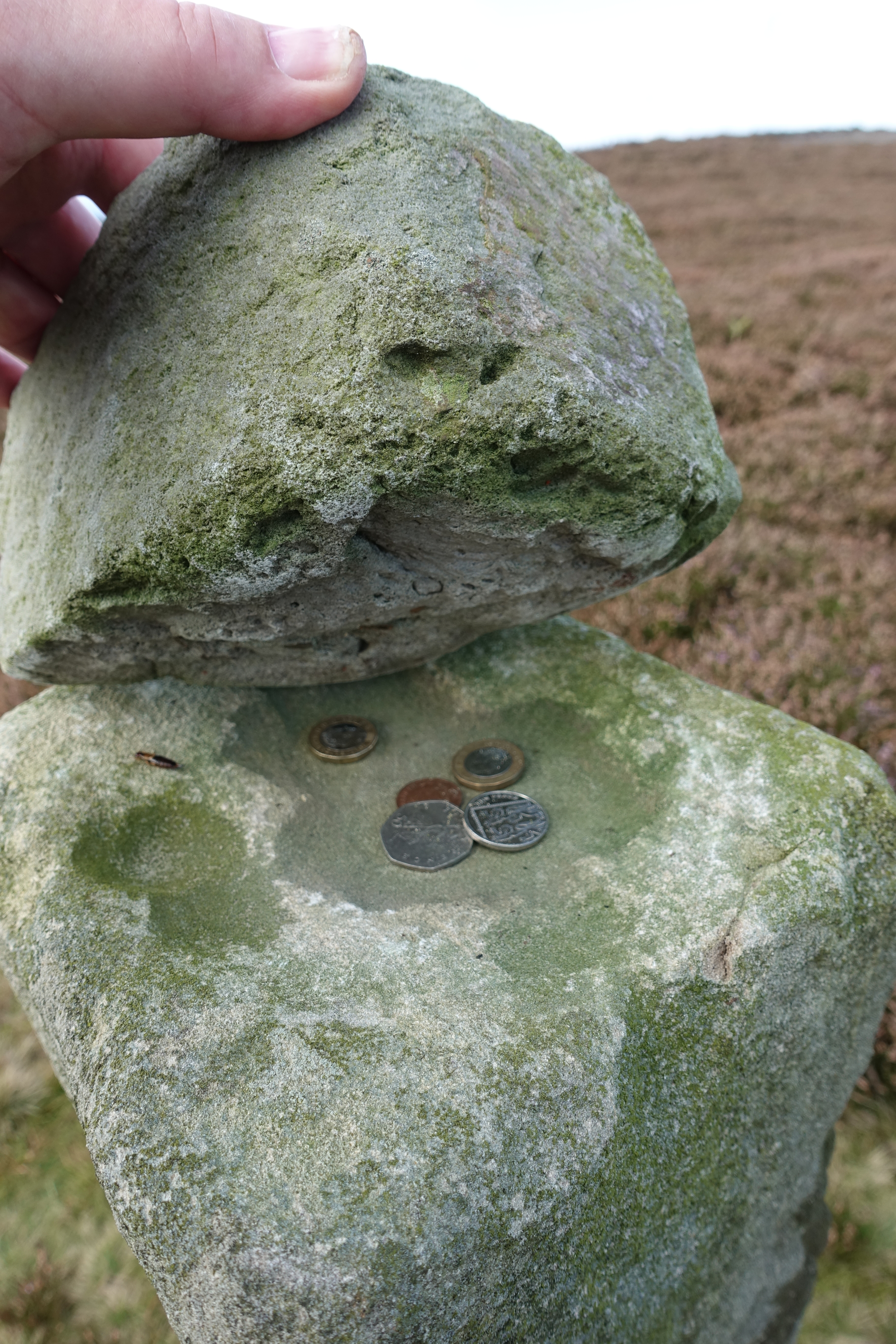 Today’s walk is a grand sweeping horseshoe round the plains below. Roseberry Topping looms ahead but steadily draws nearer. I really enjoyed this days walking. The path rises and dips, but is mostly pretty easy going. The mist swirled away to elsewhere and views were grand. Barely a soul on trail. I was feeling pretty good today and pleased that a bit of the easy gait that I developed on my long walk in 2018 was still with me and I even, despite my weight gain since finishing that walk, happily jogged on a couple of easier downward stretches. Near Jenny Bradley’s Cross I left the trail briefly to visit the 18th century Guide Stone. There is a hollow on the top of this, protected by a small stone. By tradition money could be deposited here for walkers in need. I left a handful of coins with those already present.