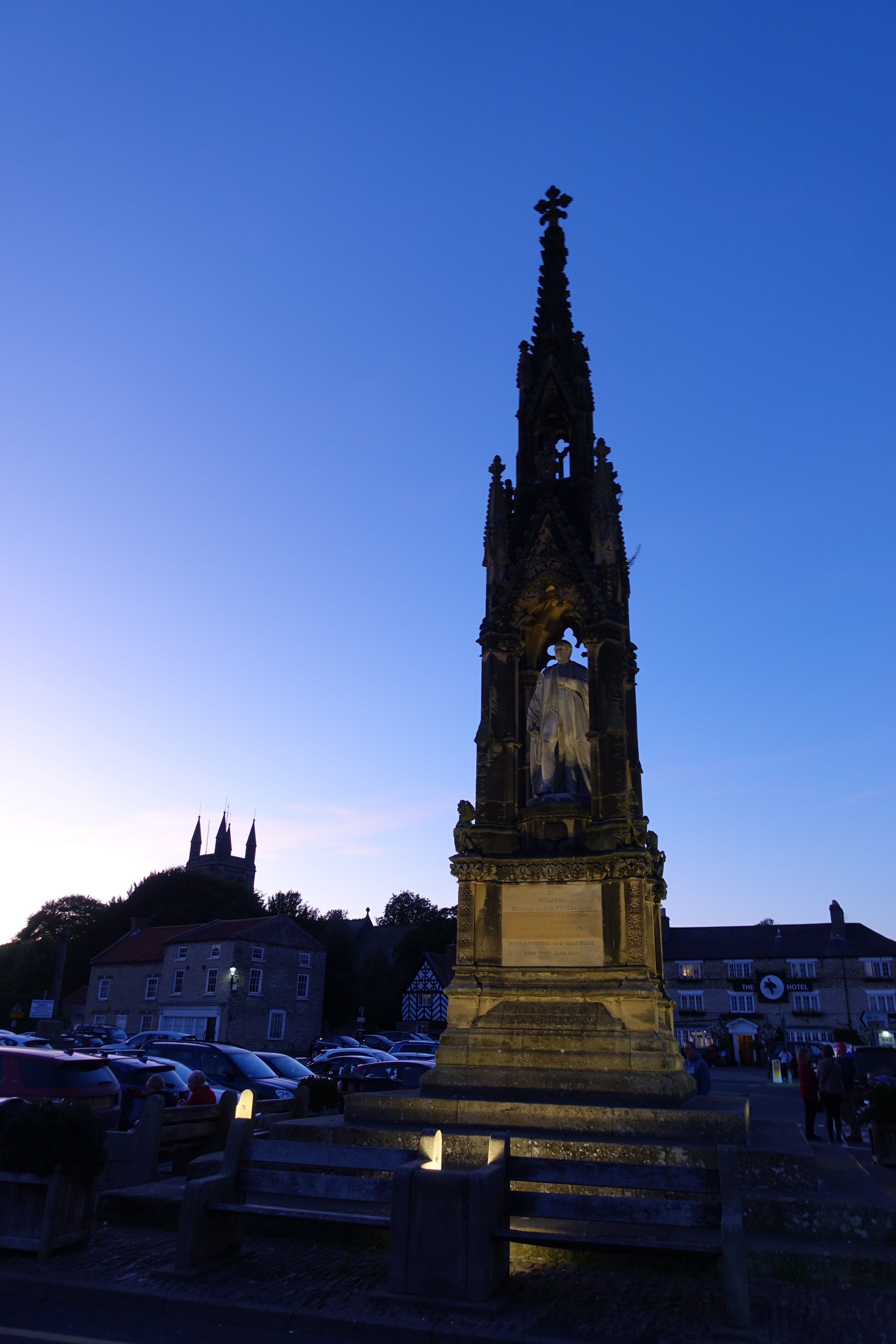 Inside, warden Katherene was already frazzled, short-staffed, and I decided it wasn’t the time to winge about being kept outside in the cold but dry and sunny courtyard for just fifteen minutes. I shared a single sex dorm room with just two other occupants- a young lad and an older hiker who turned up later that evening. Having showered and carried out a last check of gear, including filling water bottles in readiness, a short walk back into town to look for a chippie. The first I passed was open but had no trade, the second, nearer the town square was heaving. I decided this was the evening rush and went back down to the brewery for another pint of excellent Striding the Ridge. I regarded this almost as a duty as this is the ‘official beer of the Cleveland Way’ and a donation is made to the trail with every pint sold. The chippy was a little quieter when I returned so I was able to sit at the foot of the imposing memorial to the Second Baron Feversham in the darkening market square and enjoy haddock, chips and mushy peas, watching the bats circling around the floodlit stone picking off the odd moth.
