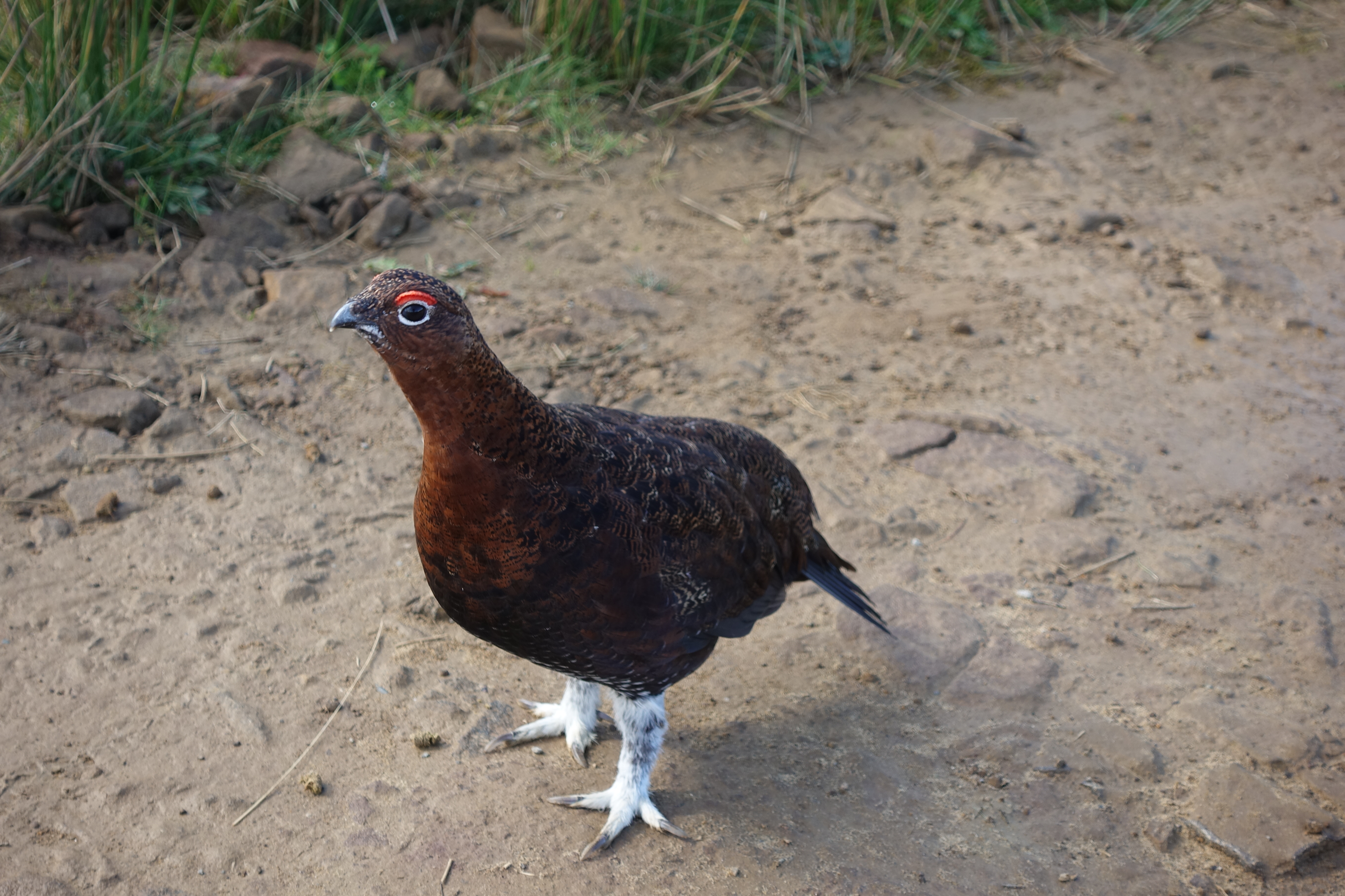 Red Grouse were frequently seen, most noisily flapped away on my approach, scolding me as they left. On sandy tracks I could frequently get quite close before they noticed me. When they did, they leapt in the air in desperate fright before going just far enough that they could land on a bit of higher ground, and, bending low, creep through the heather while keeping an eye on me. One bird however wasn’t having any of it. It was his bit of land and he wanted me away from there. He never flew. Instead, he stood his ground as I approached. Raised his tail and made a number of charges toward me. I gently fended him away with my trekking pole but he continued to escort me away from his patch. A brave fellow, I left him to it.