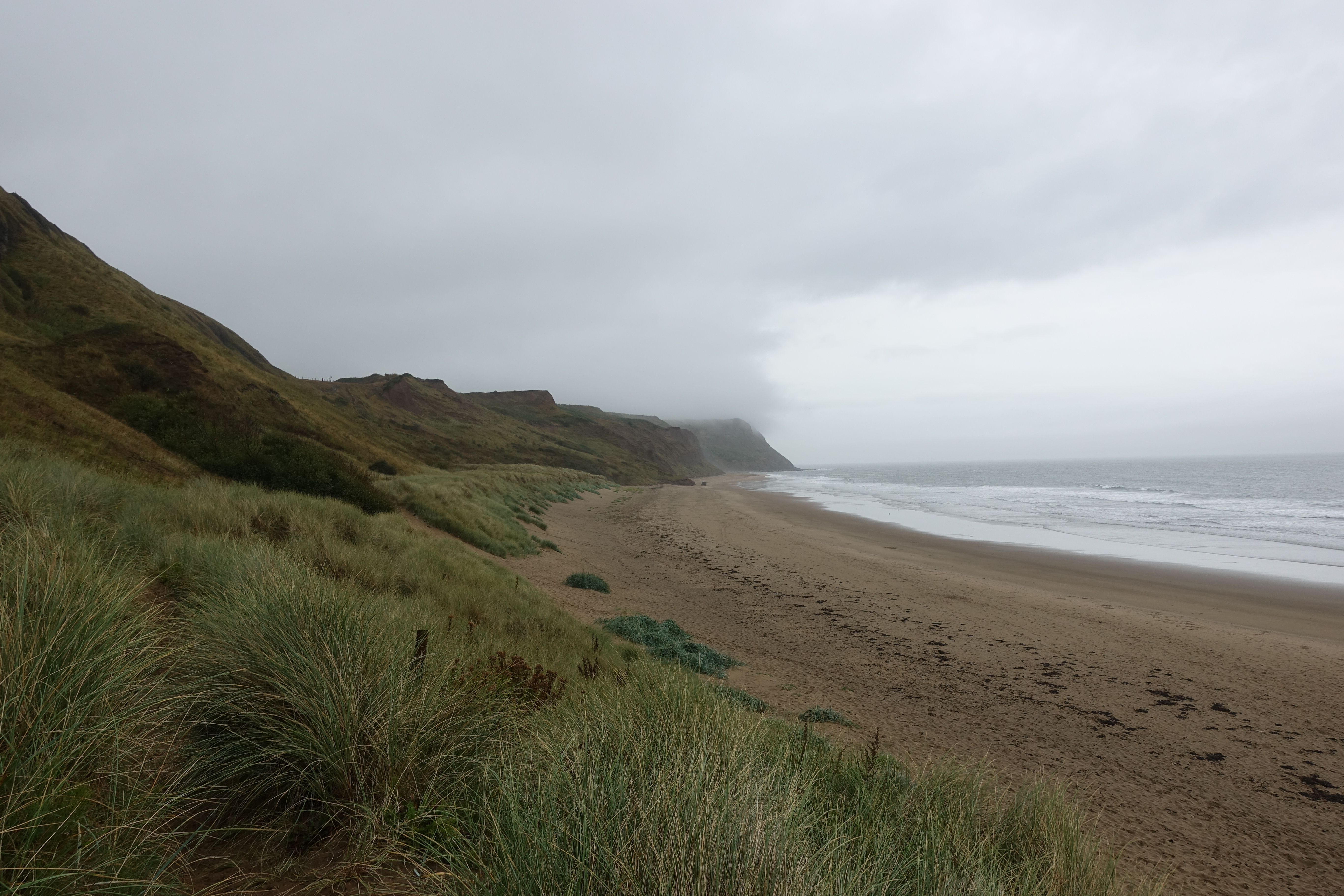 I skipped breakfast with the expectation of finding some later in the morning. Down into the quiet streets of Runswick. It has endured tragedy in the past. The entire village slipped into the sea in 1664 and the new red roofed houses were rebuilt further back. The tide was out so I was able to walk along the sands, past the boat club to the second ravine where I climbed back to the top of the cliffs.This section of coast endured considerable mining for Alum and the scars of the former industry are frequently visible particularly at Kettleness where the extensive alum workings, derelict railway and tunnels can be seen. Greatly enjoying my walk along here I followed the old cinder trackbed into Sandsend where I at last had a brekkie of sausage and bacon roll with pot of tea at the Tides cafe.