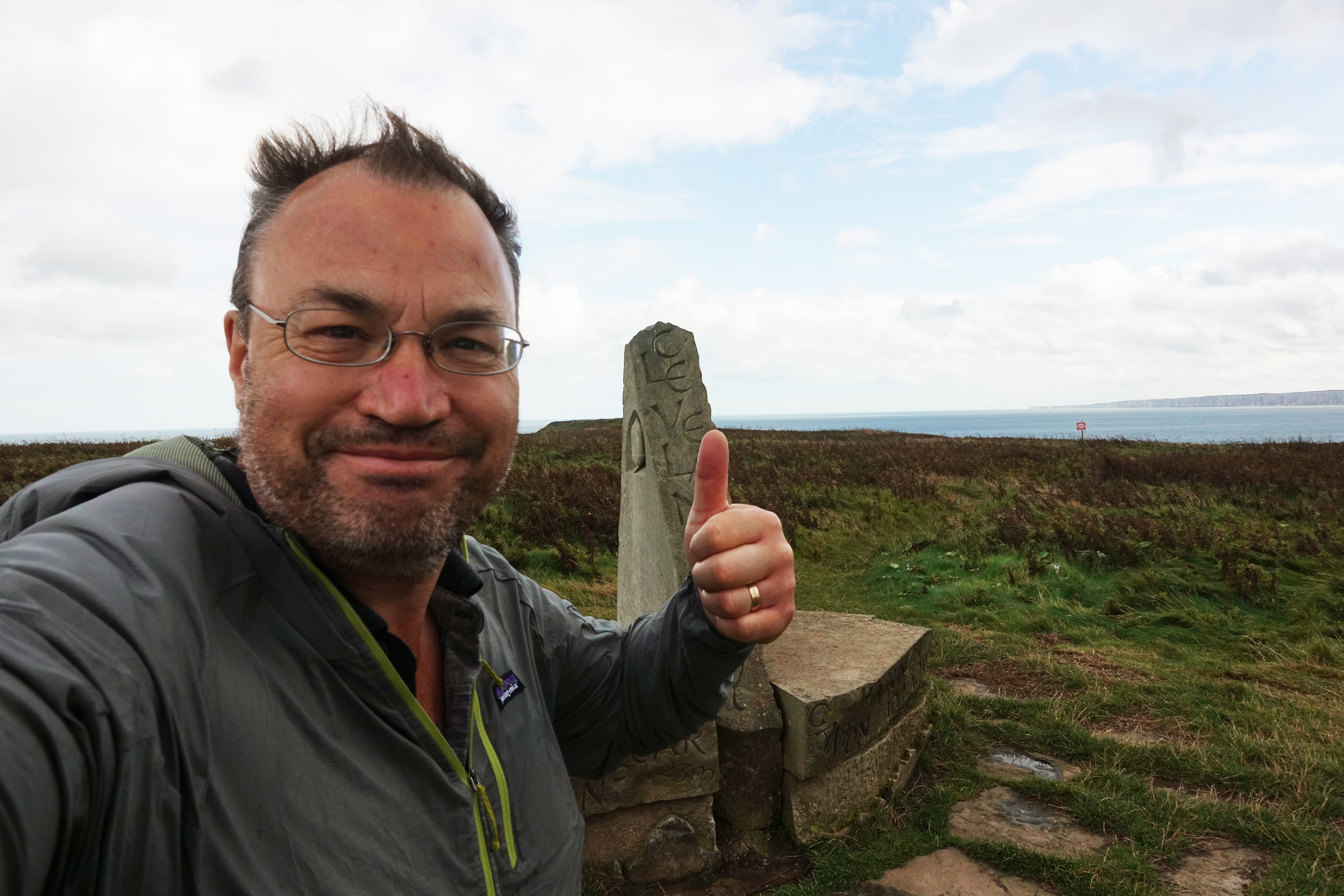 At the end of the promenade it was a walk back up to the cliff tops and onward. Good walking, lots of day trippers, some rain showers, both light and heavy, the wind quite strong and threatening to push me off the cliff edge. Though I was only carrying a windshirt which eventually wetted out, I was warm beneath this. I dropped down to Cayton Bay for lunch. Two mugs of tea and a massive cheeseburger were £8.60. The weather really kicked in for the afternoon all the way to the stone sculpture at Filey Brigg. A couple of people paused from battling the elements during their brief walk from their car to take my ‘triumphant’ photo. The rain briefly cleared off and I then walked out to the end, the tide was in so thankfully I didn’t have to brave Brigg End.