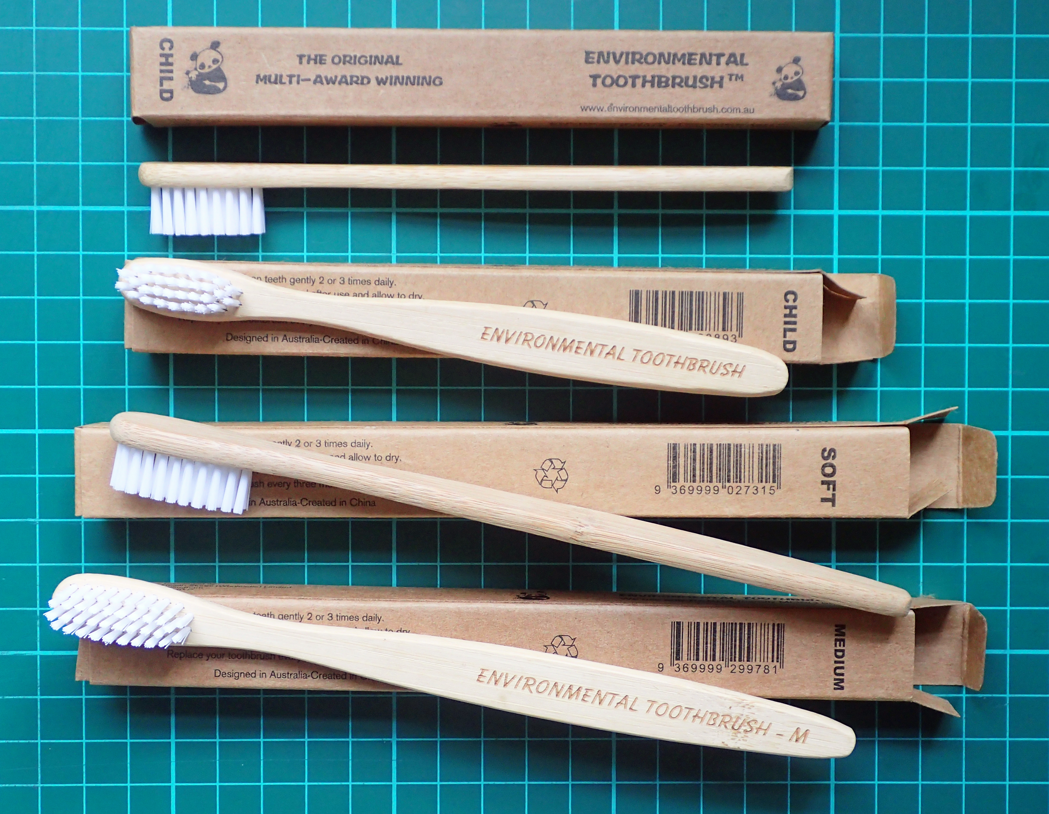 Toothbrushes from Muji and The Environmental Toothbrush. Full size Muji above weighs 14g, Bamboo handled Child size option below weighs 5g