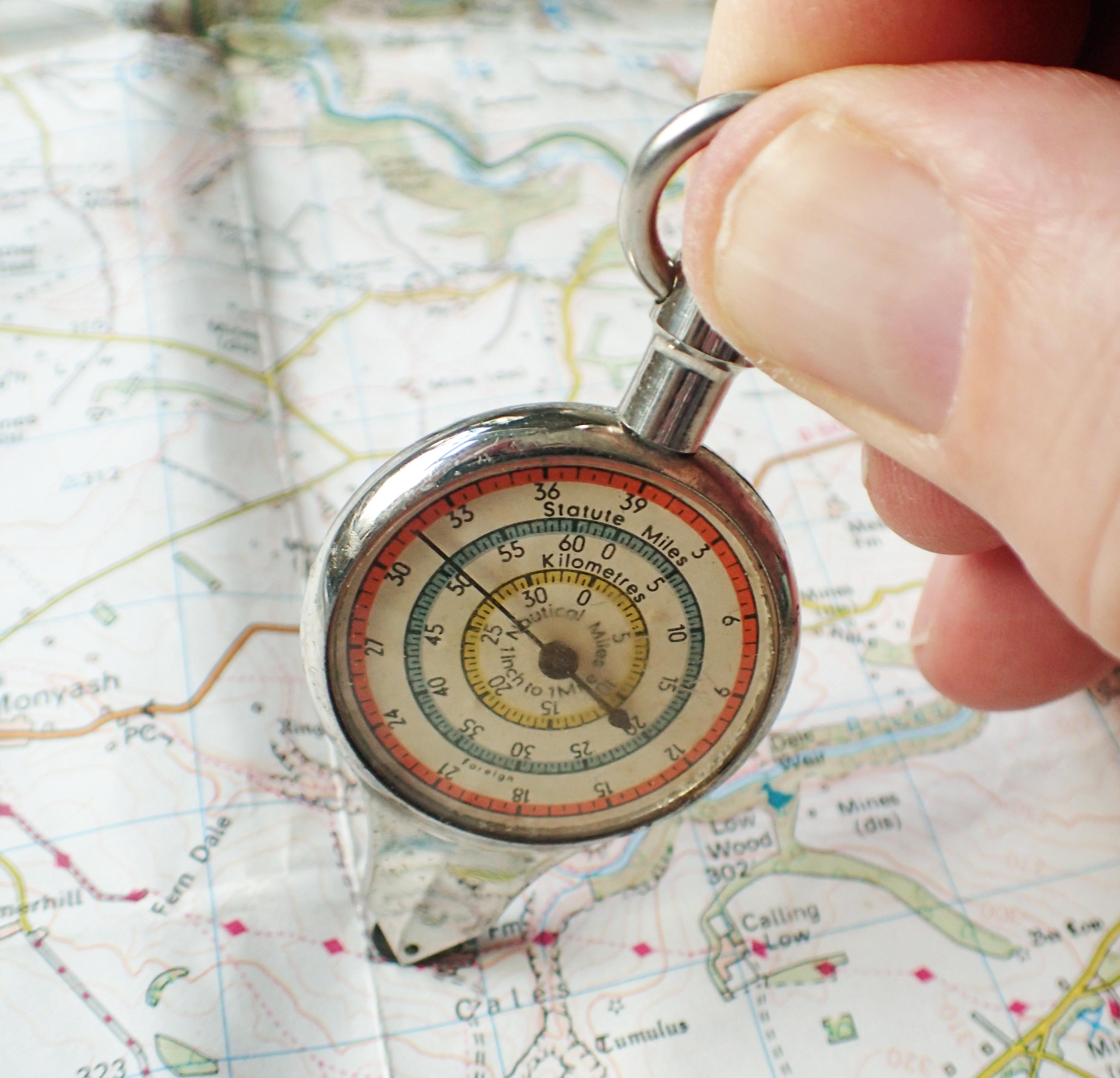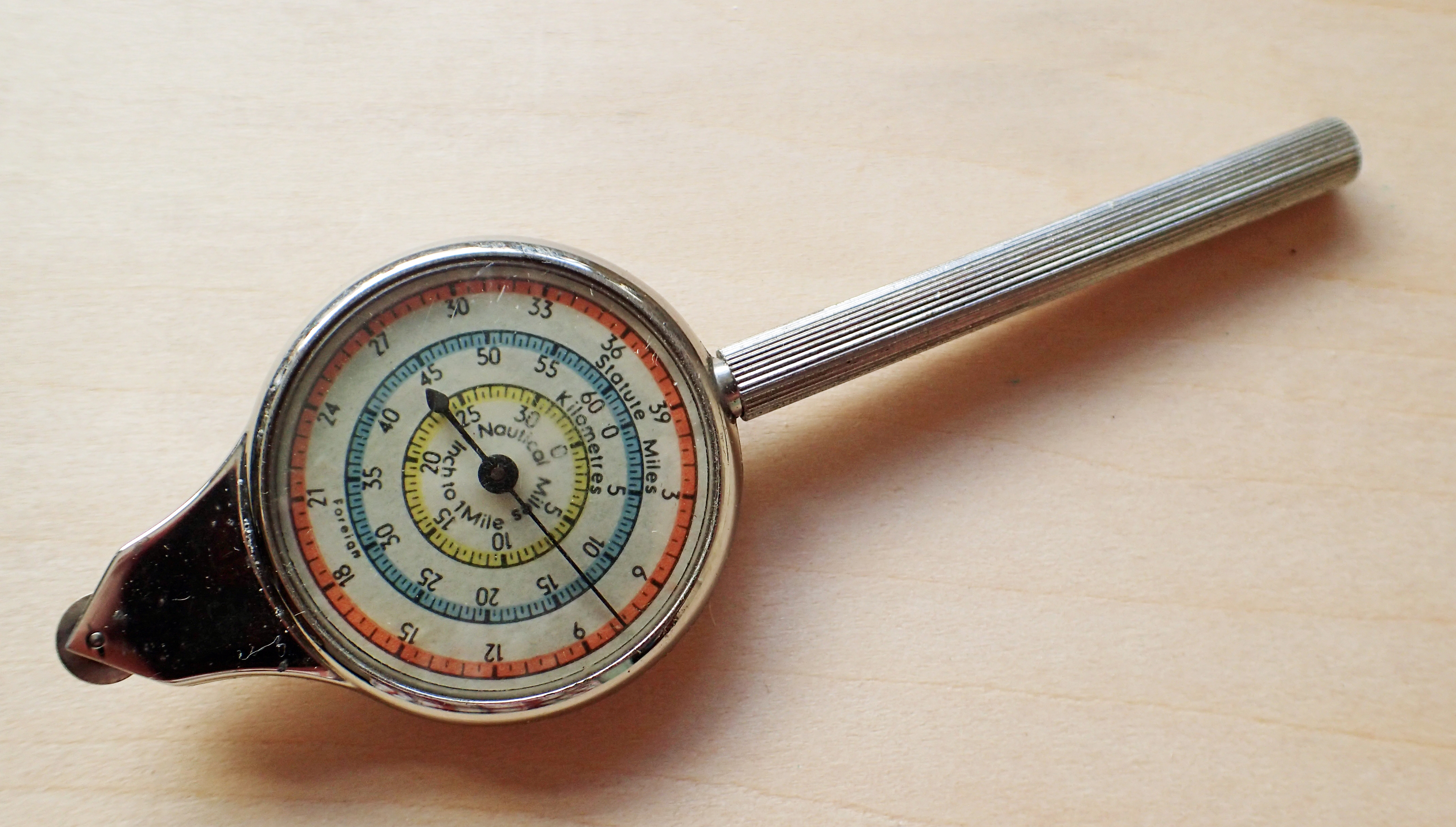 Purchasers of the Pathfinder map measure could choose one of two paper dial options. This is the inch to mile/centimetre to kilometre choice