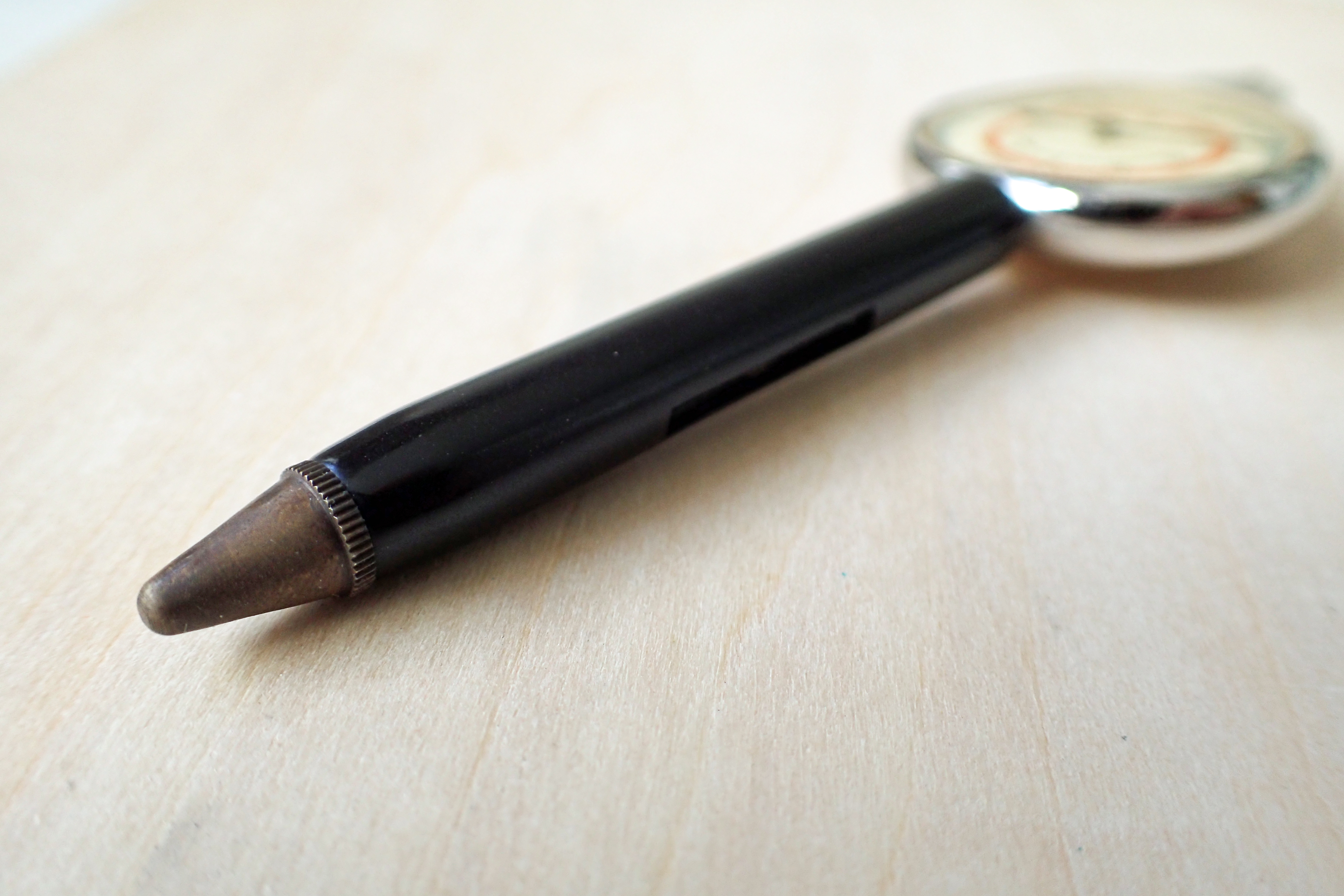 Twisting the barrel reveals the propelling lead/graphite. Sadly this is not a particularly well made product as the barrels frequently split on this measure, indeed my example is also split toward the end as a result of internal pressure and most I have seen for sale also exhibit similar failure. It still works though and the lead is replaceable.