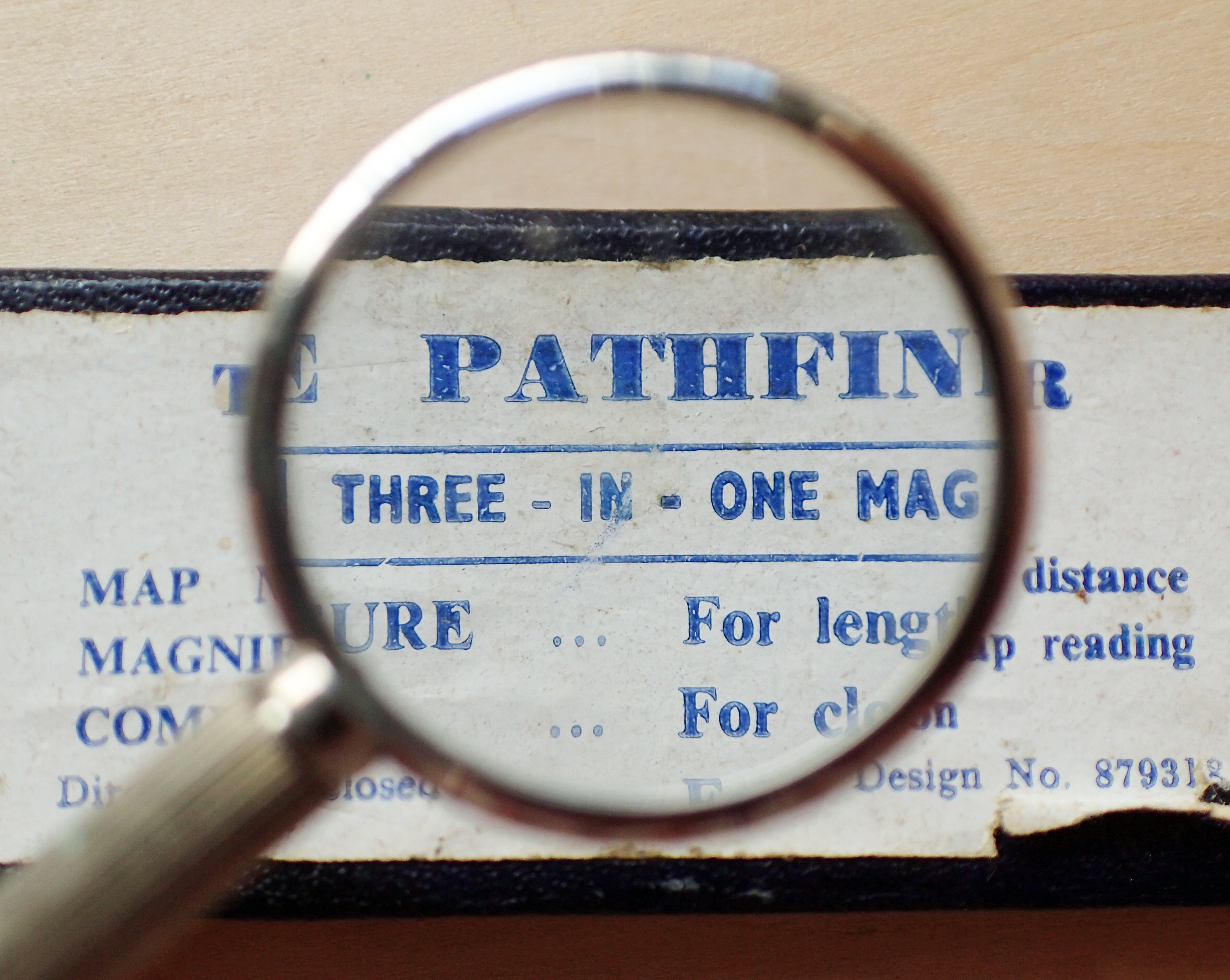 An uncommon variety of the Pathfinder map measurer was the Pathfinder de Luxe- ‘combined compass . map measure . magnifier’. Based on the short handled variety with map measurer on front face and compass on the rear, this also features a magnifying glass that can swivel out from in front of the map measurer dial to be used while perusing maps etc.