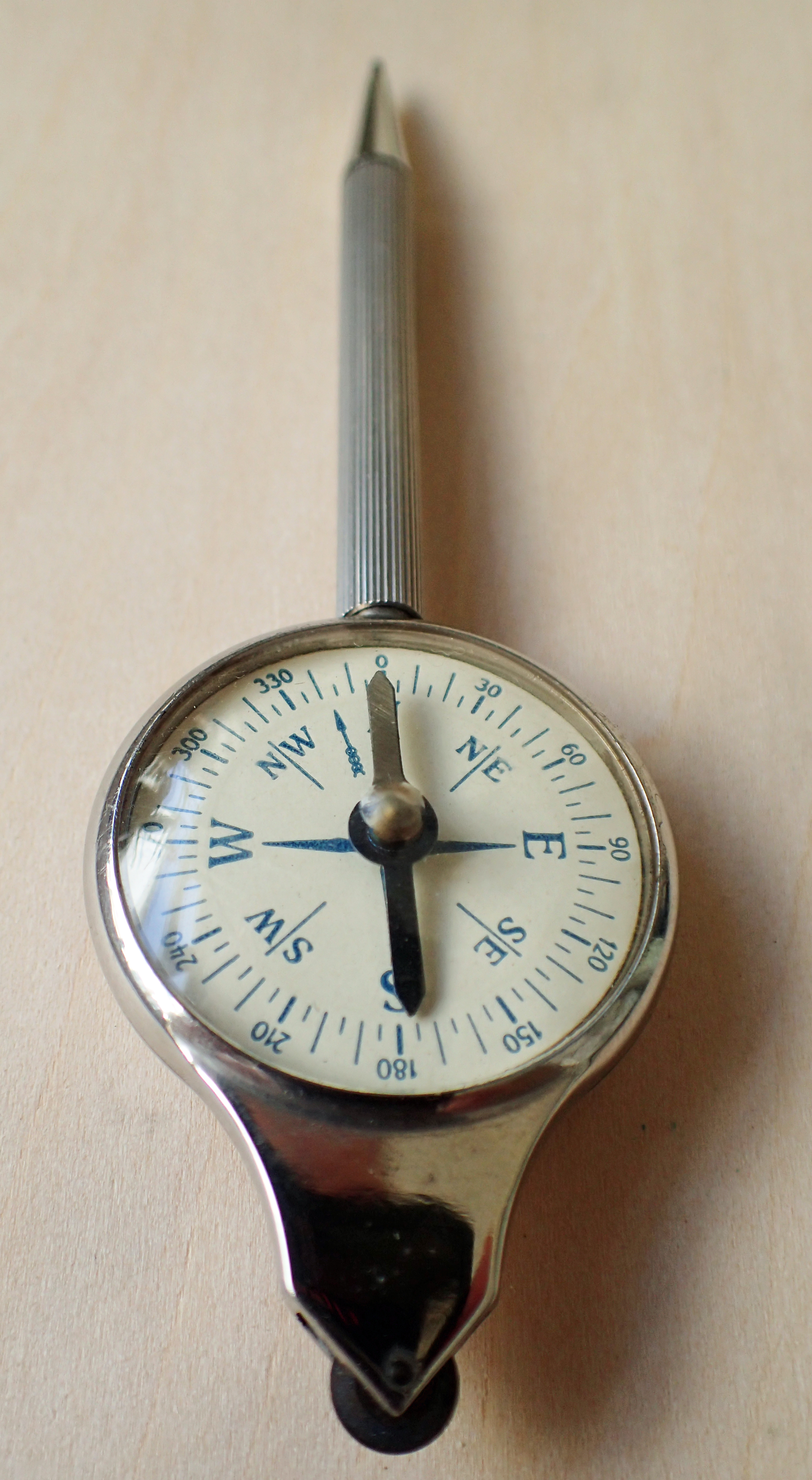 The metal bodied measure has two faces-front and reverse. Map measure on one and if not another measuring dial, then a simple magnetic compass on the reverse. The compass is not liquid filled and the needle fluctuates wildly before settling. However, it works. Cardinal and ordinal points are shown, incorporating 30° intervals, indicated with figures, around the outer edge. Between these, every 5° is included. And that is it. I wouldn’t like to rely on the compass as a primary navigational aid but if such a measure were carried in the glove box of a car, then it probably sufficed reasonably well.