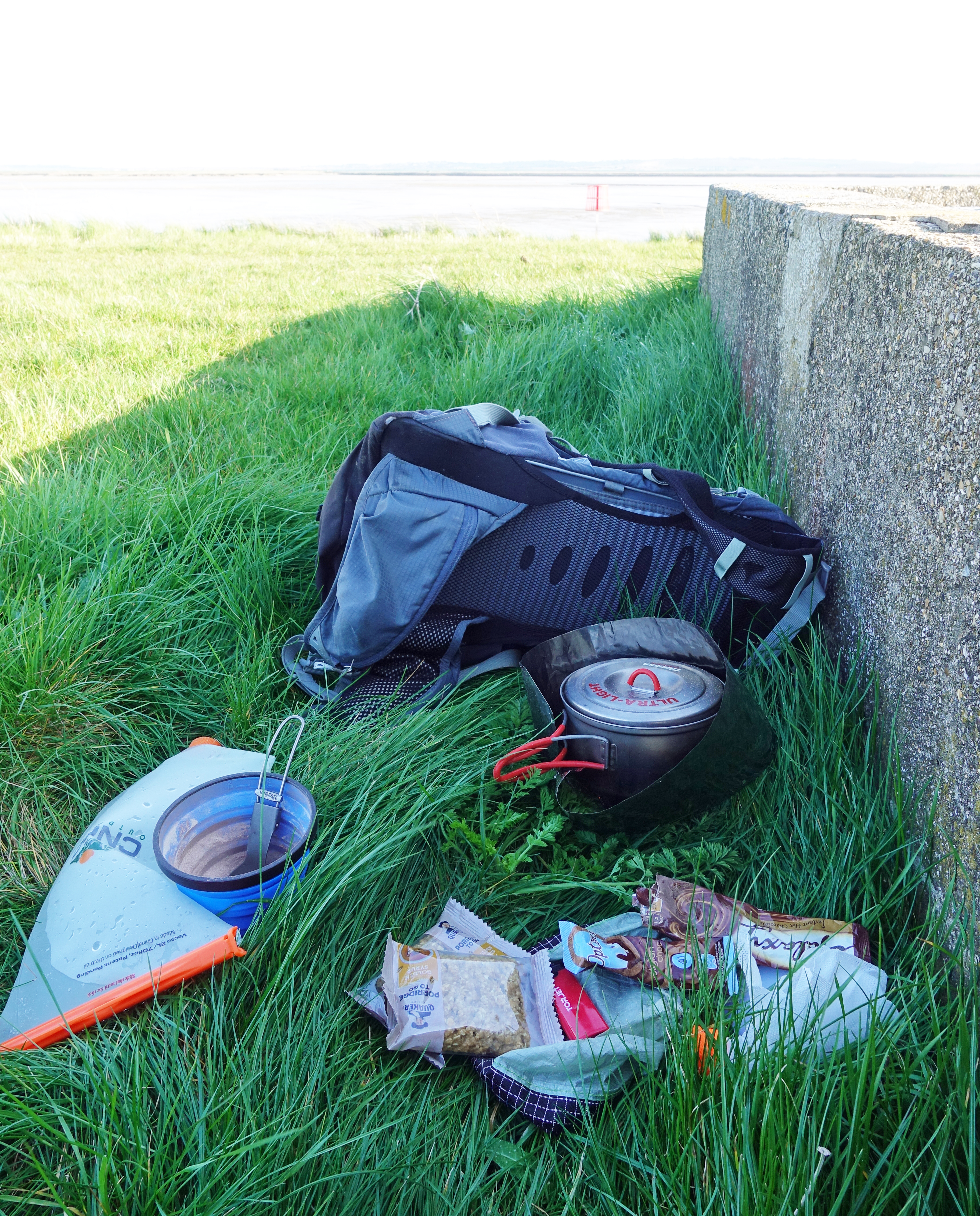There isn’t a lot of shelter from the stiff cold wind along the seawall, so I made use of one of the concrete sluices to breakfast on hot chocolate and Quaker’s Golden Syrup Porridge To Go